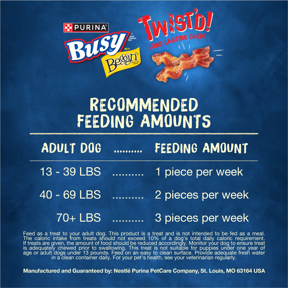 FEEDING INSTRUCTIONS Feed as a treat to your adult dog. This product is a treat and is not intended to be fed as a meal. The caloric intake from treats should not exceed 10% of a dog’s total daily caloric requirement. If treats are given, the amount of food should be reduced accordingly. Monitor your dog to ensure treat is adequately chewed prior to swallowing. This treat is not suitable for puppies under one year of age or adultdogs under 5 pounds or over 35 pounds. Feed on an easy to clean surface. Provide adequate fresh water in a clean container daily. For your pet’s health, see your veterinarian regularly.