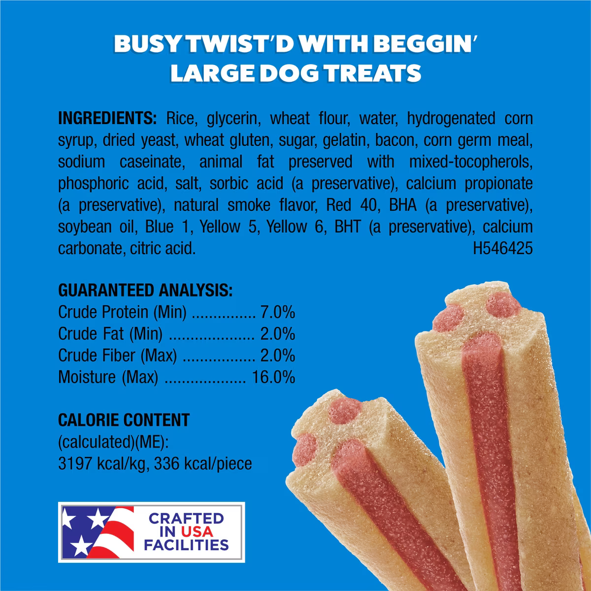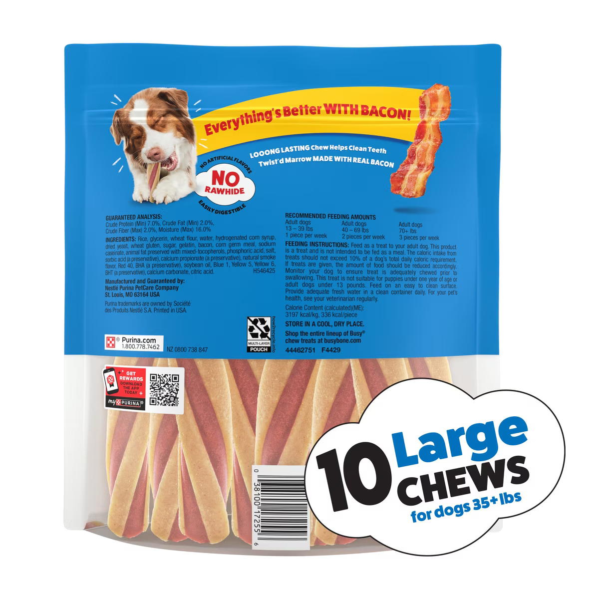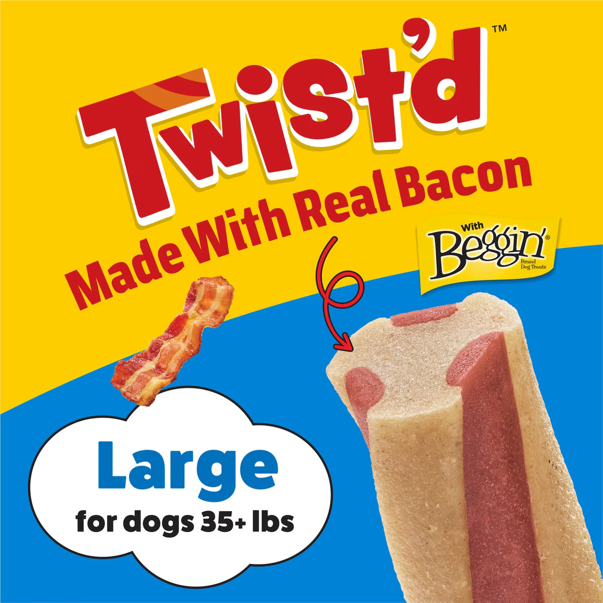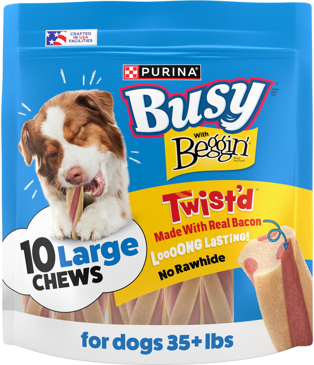 Busy Bone Twist’d dog treats with the meaty goodness of Beggin’ bacon flavor for your large dog.