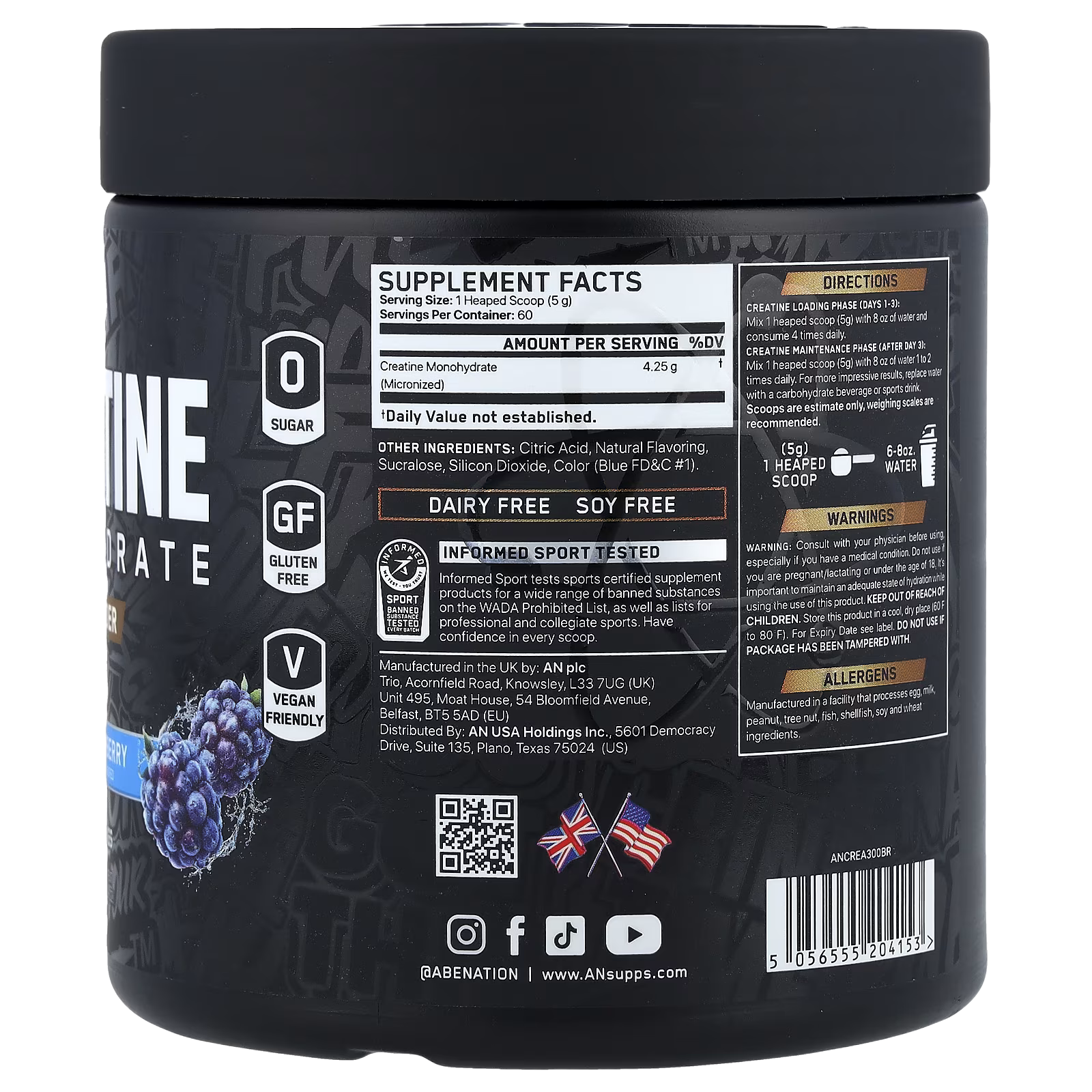 AN Creatine Monohydrate Powder is a flavored, high-quality creatine monohydrate. Creatine Monohydrate increases physical performance in successive bursts of short-term, high-intensity exercise delivering muscular energy to crush your fitness goals.