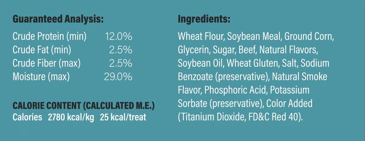 Wheat Flour, Soybean Meal, Ground Corn, Glycerin, Sugar, Beef, Natural Flavors, Soybean Oil, Wheat Gluten, Salt, Sodium Benzoate (preservative), Natural Smoke Flavor, Phosphoric Acid, Potassium Sorbate (preservative), Color Added (Titanium Dioxide, FD&C Red 40).