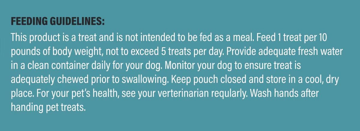This product is a treat and is not intended to be fed as a meal. Feed 1 treat per 10 pounds of body weight, not to exceed 5 treats per day. Provide adequate fresh water in a clean container daily for your dog. Monitor your dog to ensure treat is adequately chewed prior to swallowing. Keep pouch closed and store in a cool, dry place. For your pet’s health, see your veterinarian regularly. Wash hands after handing pet treats.