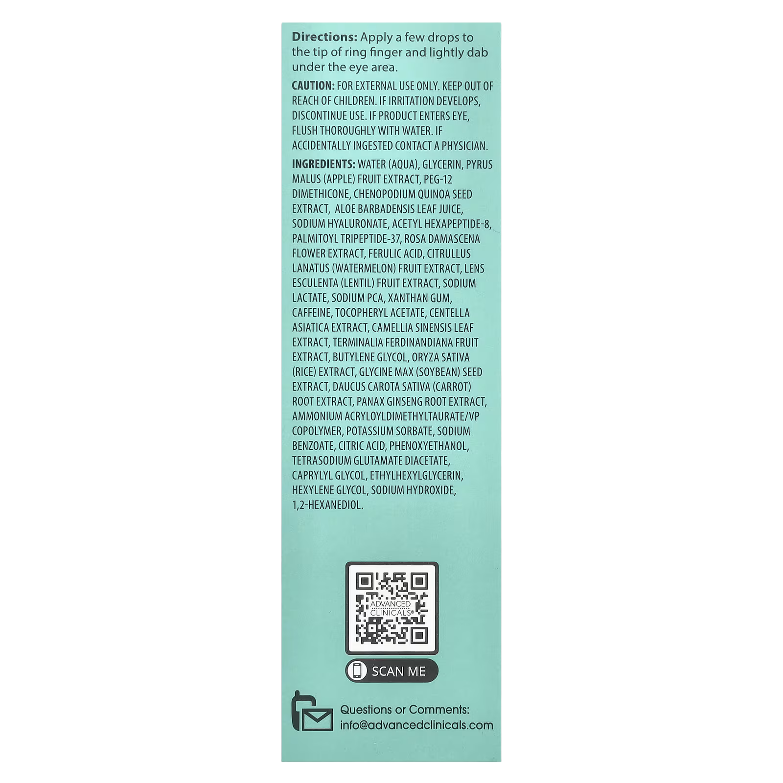 Water (aqua), glycerin, pyrus malus (apple) fruit extract, peg-12 dimethicone, chenopodium quinoa seed extract, aloe barbadensis leaf juice, sodium hyaluronate, acetyl hexapeptide-8, palmitoyl tripeptide-37, rosa damascena flower extract, ferulic acid, citrullus lanatus (watermelon) fruit extract, lens esculenta (lentil) fruit extract, sodium lactate, sodium pca, xanthan gum, caffeine, tocopheryl acetate, centella asiatica extract, camellia sinensis leaf extract, terminalia ferdinandiana fruit extract, butylene glycol, oryza sativa (rice) extract, glycine max (soybean) seed extract, daucus carota sativa (carrot) root extract, panax ginseng root extract, ammonium acryloyldimethyltaurate/vp copolymer, potassium sorbate, sodium benzoate, citric acid, phenoxyethanol, tetrasodium glutamate diacetate, caprylyl glycol, ethylhexylglycerin, hexylene glycol, sodium hydroxide, 1,2-hexanediol.Made in USA with globally sourced materials.WarningsFor external use only. Keep out of reach of children. If irritation develops, discontinue use. If product enters eye, flush thoroughly with water. If accidentally ingested contact a physician.