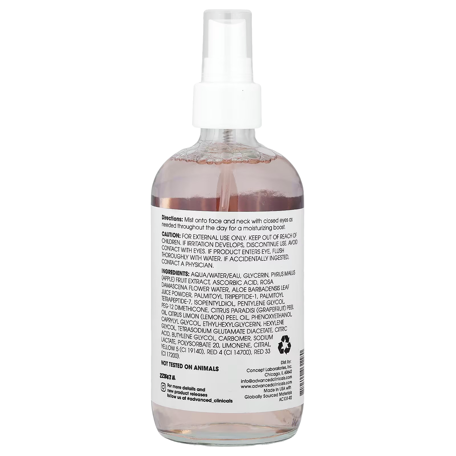 Aqua/water/eau, glycerin, pyrus malus (apple) fruit extract, ascorbic acid, rosa damascena flower water, aloe barbadensis leaf juice powder, palmitoyl tripeptide-1, palmitoyl tetrapeptide-7, isopentyldiol, pentylene glycol, peg-12 dimethicone, citrus paradisi (grapefruit) peel oil, citrus limon (lemon) peel oil, phenoxyethanol, caprylyl glycol, ethylhexylglycerin, hexylene glycol, tetrasodium glutamate diacetate, citric acid, butylene glycol, carbomer, sodium lactate, polysorbate 20, limonene, citral, yellow 5 (ci 19140), red 4 (ci 14700), red 33 (ci 17200).