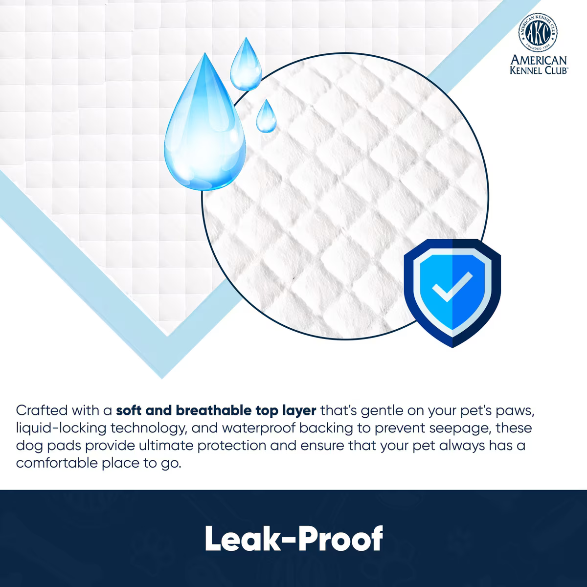 American Kennel Club AKC Dog Training Pads are ideal for puppies and adult pups that stay indoors for long periods of time. These generously sized pads offer an innovative six layers of protection. The top is a soft, quilted layer that’s gentle on your furbaby’s paws. The leak-proof baking prevents seepage and protects your floors. Plus, there’s superabsorbent polymer technology to instantly absorb and retain large amounts of liquids so your tail wagger’s paws stay dry. And, the three-in-one attractant formula entices, engages, and encourages your four-legged family member to use the pad to ease training for pet parents. From the tear-resistant top sheet to the waterproof backing, every layer works together seamlessly to provide maximum absorption and protection. Perfect for puppy training, senior furbabies, apartment living, or busy schedules, AKC Training Pads offer a reliable indoor solution.