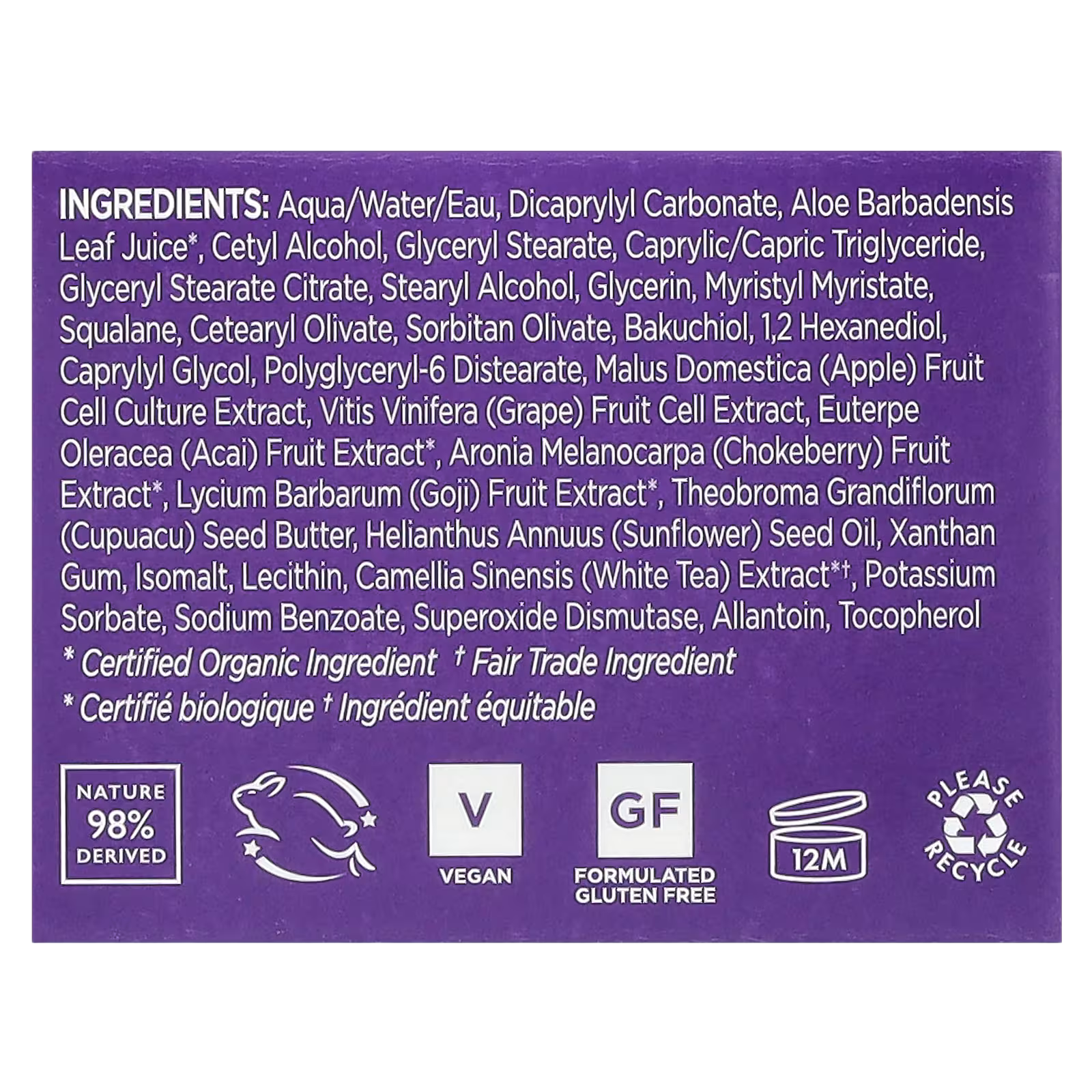 Aqua/water/eau, dicaprylyl carbonate, aloe barbadensis leaf juice *, cetyl alcohol, glyceryl stearate, caprylic/capric triglyceride, glyceryl stearate citrate, stearyl alcohol, glycerin, myristyl myristate, squalane, cetearyl olivate, sorbitan olivate, bakuchiol, 1,2 hexanediol, caprylyl glycol, polyglyceryl-6 distearate, malus domestica (apple) fruit cell culture extract, vitis vinifera (grape) fruit cell extract, euterpe oleracea (acai) fruit extract *, aronia melanocarpa (chokeberry) fruit extract *, lycium barbarum (goji) fruit extract *, theobroma grandiflorum (cupuacu) seed butter, helianthus annuus (sunflower) seed oil, xanthan gum, isomalt, lecithin, camellia sinensis (white tea) extract*†, potassium sorbate, sodium benzoate, superoxide dismutase, allantoin, tocopherol.*Certified Organic Ingredient†Fair Trade IngredientWarnings