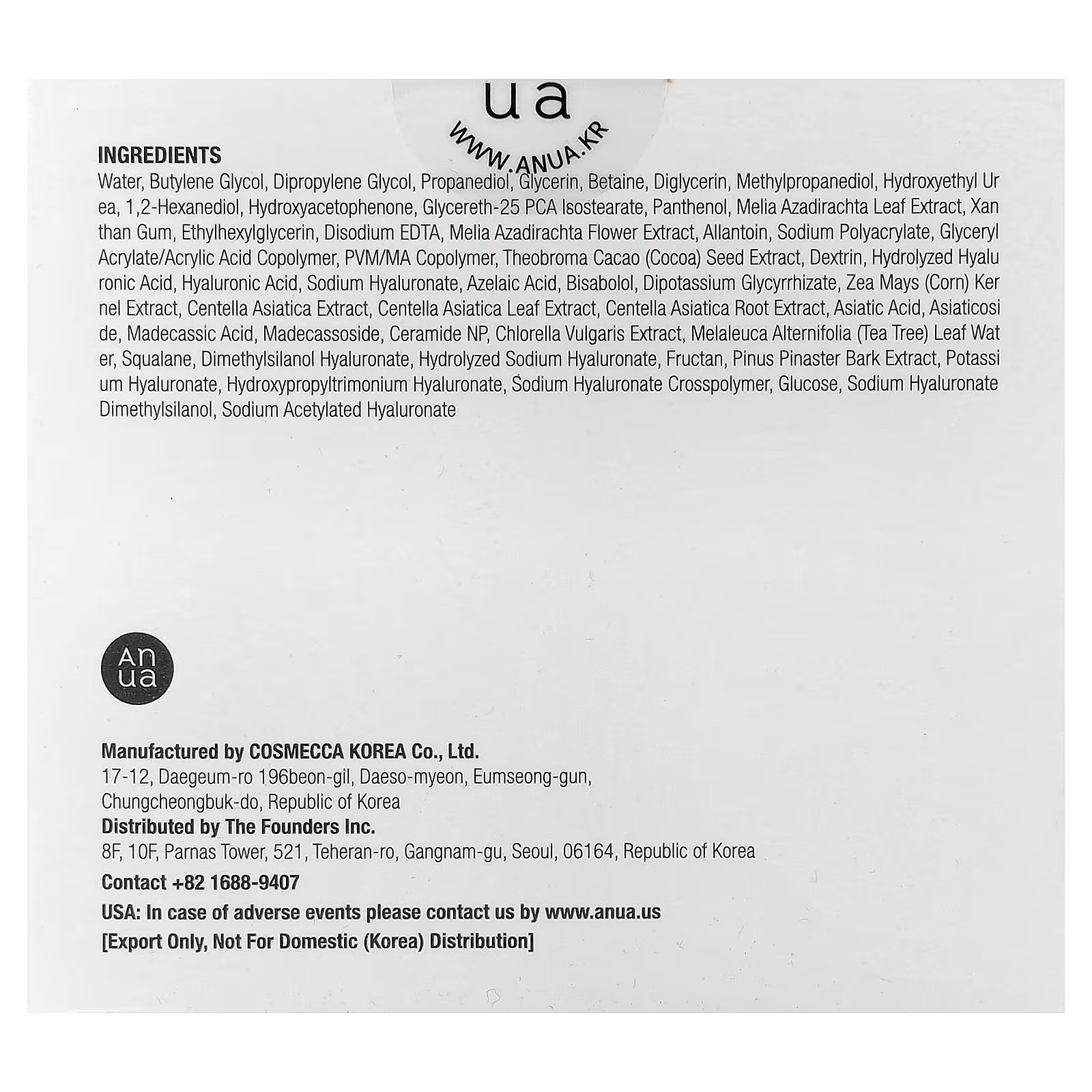 *Anua Azelaic Calming Complex™: Water, 1,2-hexanediol, ethylhexylglycerin, azelaic acid, melaleuca alternifolia (tea tree) leaf water, chlorella vulgaris extract, madecassoside, asiaticoside, madecassic acid, asiatic acid, centella asiatica leaf extract, centella asiatica root extract, centella asiatica extract, squalane, ceramide np.
