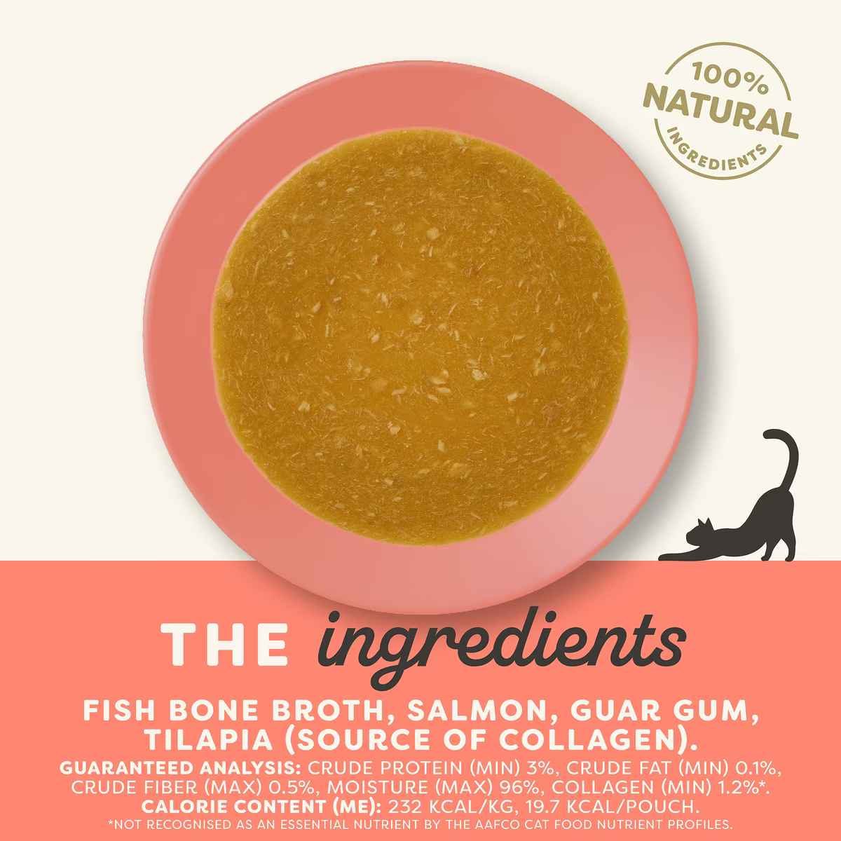 Fish Bone Broth, Salmon, Guar Gum, Tilapia (Source of Collagen).