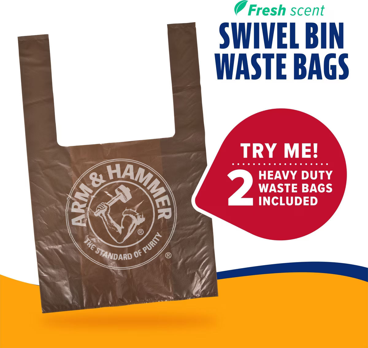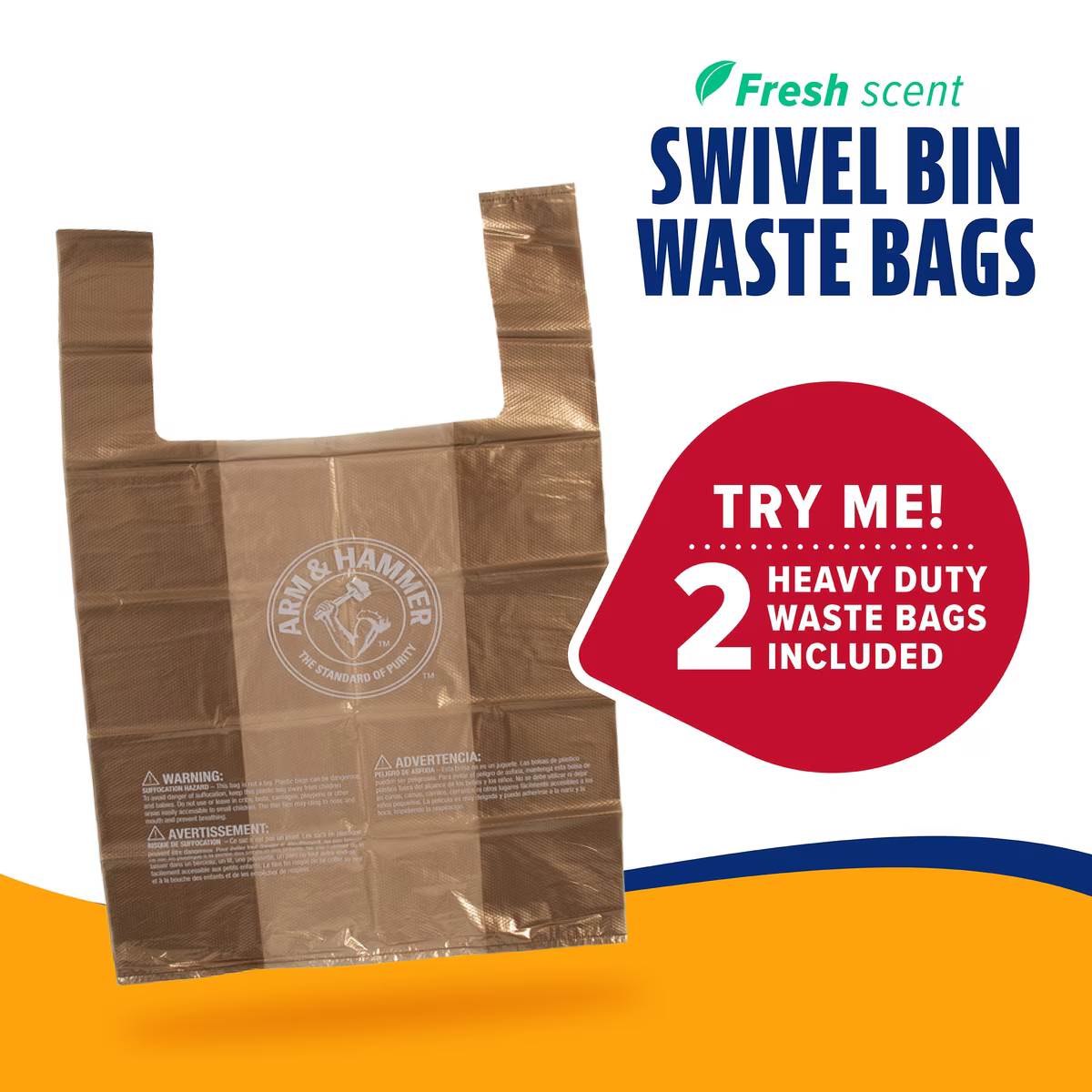 Two bonus waste bags included that are infused with activated baking soda to neutralize odors and leave a fresh scent. Compatible with Arm & Hammer heavy duty waste bags.
