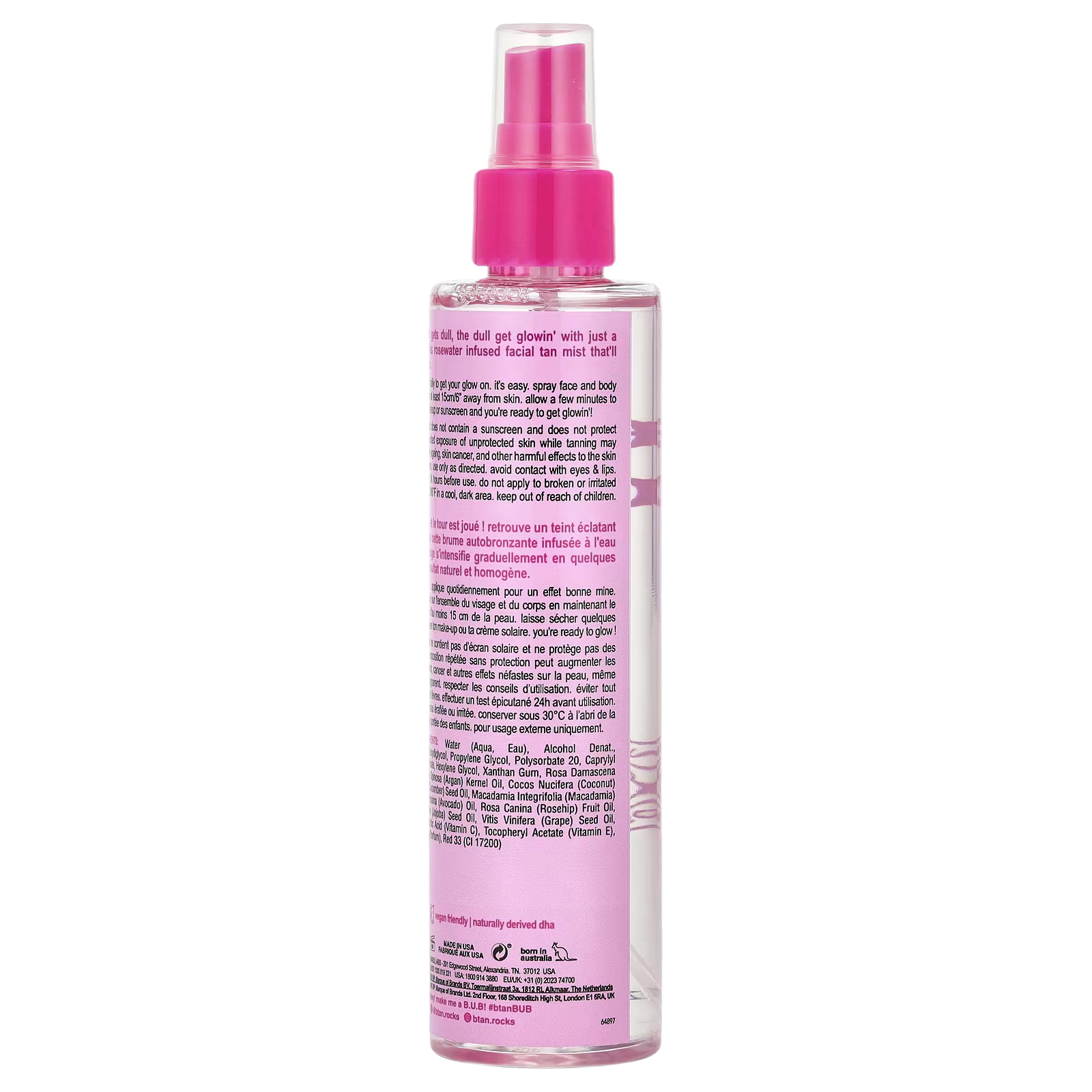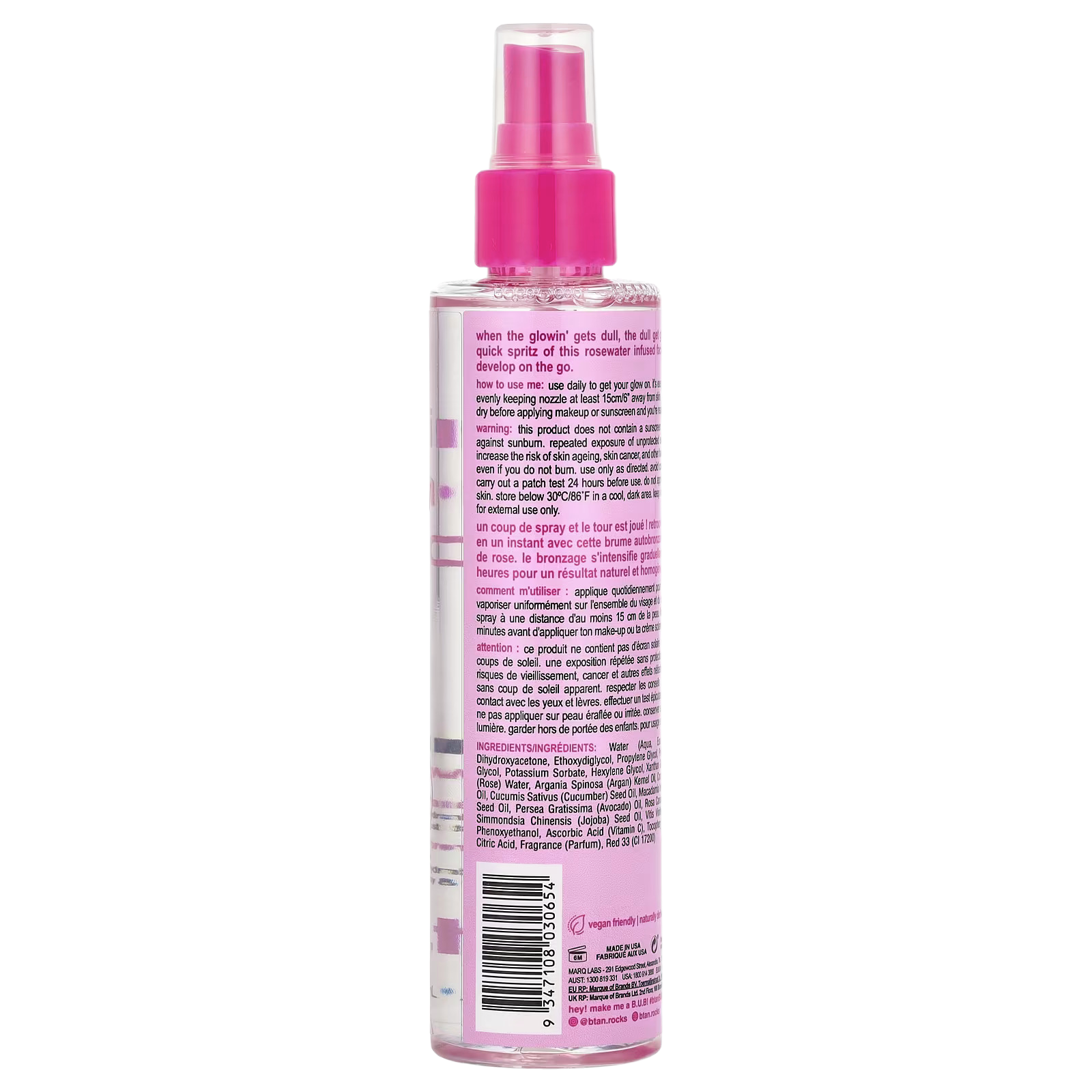 Water (aqua, eau), alcohol denat., dihydroxyacetone, ethoxydiglycol, propylene glycol, polysorbate 20, caprylyl glycol, potassium sorbate, hexylene glycol, xanthan gum, rosa damascena (rose) water, argania spinosa (argan) kernel oil, cocos nucifera (coconut) oil, cucumis sativus (cucumber) seed oil, macadamia integrifolia (macadamia) seed oil, persea gratissima (avocado) oil, rosa canina (rosehip) fruit oil, simmondsia chinensis (jojoba) seed oil, vitis vinifera (grape) seed oil, phenoxyethanol, ascorbic acid (vitamin c), tocopheryl acetate (vitamin e), citric acid, fragrance (parfum), red 33 (ci 17200).