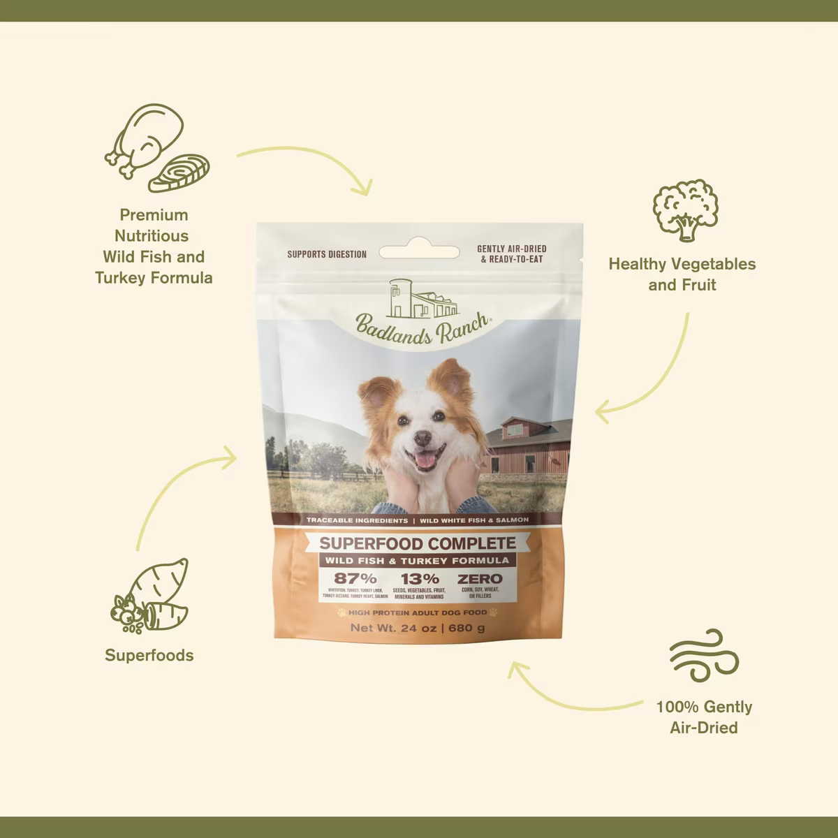 Badlands Ranch Superfood Complete Grain-Free Wild Fish & Turkey Air-Dried Dog Food, 24-oz bag