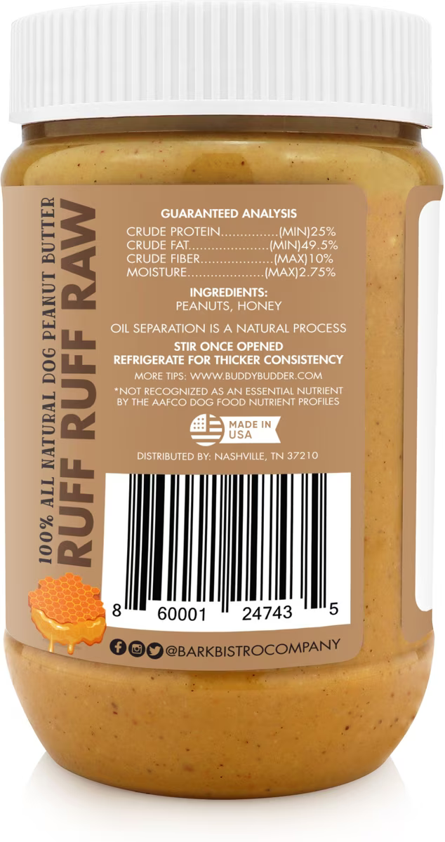 Bark Bistro Company Buddy Budder Ruff Ruff Raw Peanut Butter Lickable Dog Treats, 17-oz jar
