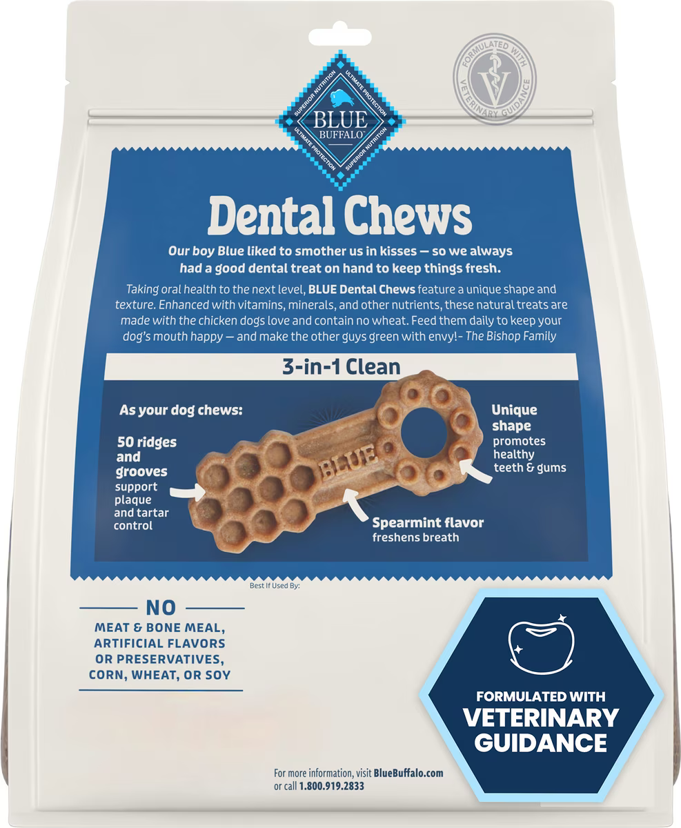 Reshape your furry friend’s daily dental routine with Blue Buffalo Dental Chews Large Natural Dog Treats, Chicken & Spearmint. Formulated with veterinary guidance, this natural treat offers a three-in-one clean. As your pup chews, 50 unique ridges and grooves support plaque and tartar control, spearmint flavor freshens breath, and a special shape promotes healthy teeth and gums. Blue Dental Chews are made with the chicken your tail wagger loves. They contain no meat or bone meal, no artificial flavors or preservatives, and no corn, wheat, or soy, so you can feel good about treating your pup. Give one treat per day to keep your barking BFF’s mouth happy and healthy—and give yourself one more excuse to snuggle up to your furry family member. Blue Dental Chews are intended for intermittent or supplemental feeding only. These treats are brought to you by Blue Buffalo, a leader in natural pet food. Love them like family. Treat them like family.