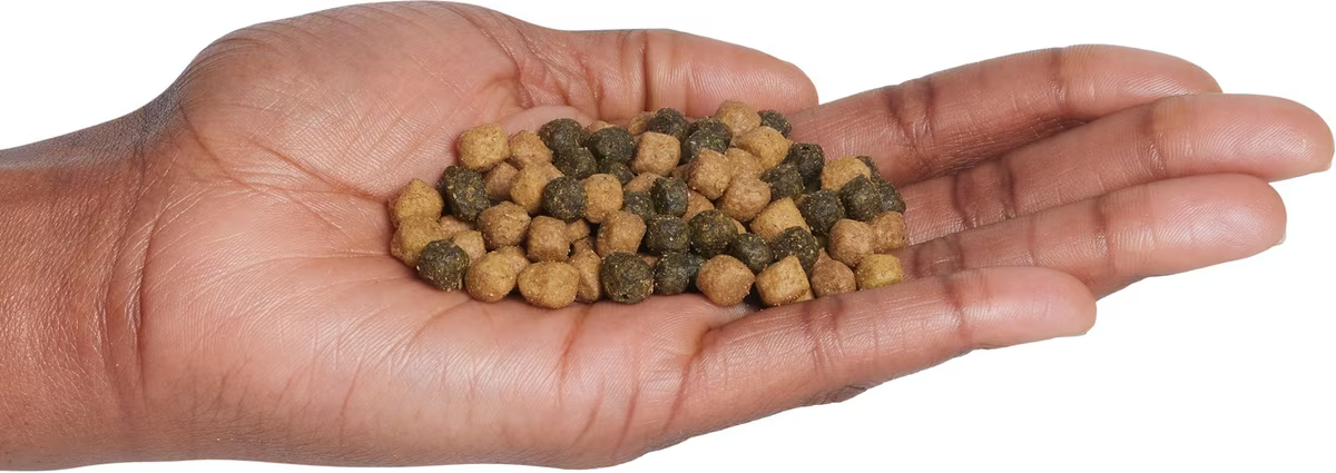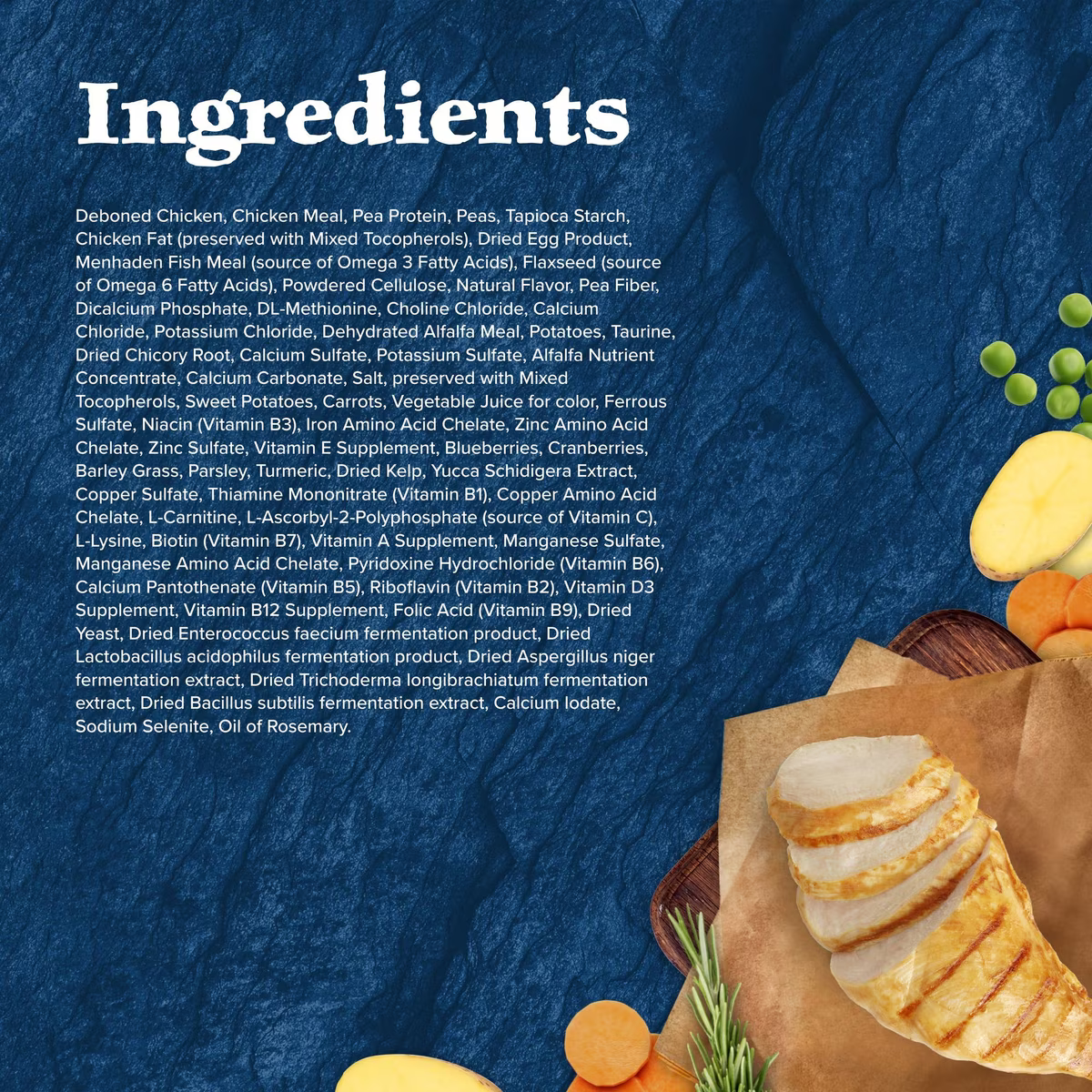 Deboned Chicken, Chicken Meal, Pea Protein, Peas, Tapioca Starch, Chicken Fat (preserved with Mixed Tocopherols), Dried Egg Product, Menhaden Fish Meal (source of Omega 3 Fatty Acids), Flaxseed (source of Omega 6 Fatty Acids), Powdered Cellulose, Natural Flavor, Pea Fiber, Dicalcium Phosphate, DL-Methionine, Choline Chloride, Calcium Chloride, Potassium Chloride, Direct Dehydrated Alfalfa Pellets, Potatoes, Taurine, Dried Chicory Root, Calcium Sulfate, Potassium Sulfate, Alfalfa Nutrient Concentrate, Calcium Carbonate, Salt, preserved with Mixed Tocopherols, Sweet Potatoes, Carrots, Vegetable Juice for color, Ferrous Sulfate, Niacin (Vitamin B3), Iron Amino Acid Chelate, Zinc Amino Acid Chelate, Zinc Sulfate, Vitamin E Supplement, Blueberries, Cranberries, Barley Grass, Parsley, Turmeric, Dried Kelp, Yucca Schidigera Extract, Copper Sulfate, Thiamine Mononitrate (Vitamin B1), Copper Amino Acid Chelate, L-Carnitine, L-Ascorbyl-2-Polyphosphate (source of Vitamin C), L-Lysine, Biotin (Vitamin B7), Vitamin A Supplement, Manganese Sulfate, Manganese Amino Acid Chelate, Pyridoxine Hydrochloride (Vitamin B6), Calcium Pantothenate (Vitamin B5), Riboflavin (Vitamin B2), Vitamin D3 Supplement, Vitamin B12 Supplement, Folic Acid (Vitamin B9), Dried Yeast, Dried Enterococcus faecium fermentation product, Dried Lactobacillus acidophilus fermentation product, Dried Aspergillus niger fermentation extract, Dried Trichoderma longibrachiatum fermentation extract, Dried Bacillus subtilis fermentation extract, Calcium Iodate, Sodium Selenite, Oil of Rosemary.