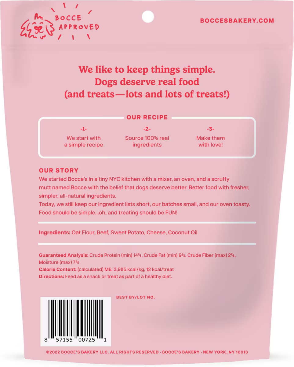 Bocce’s Bakery Burgers & Fries Beef, Sweet Potatoes & Cheese Dog Treats, 5-oz bag