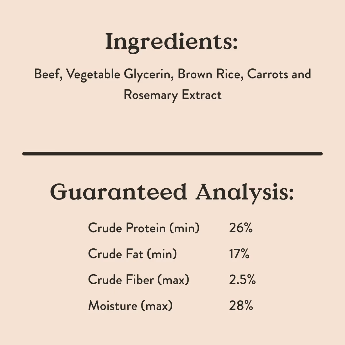 Beef, Vegetable Glycerin, Brown Rice, Carrots and Rosemary Extract