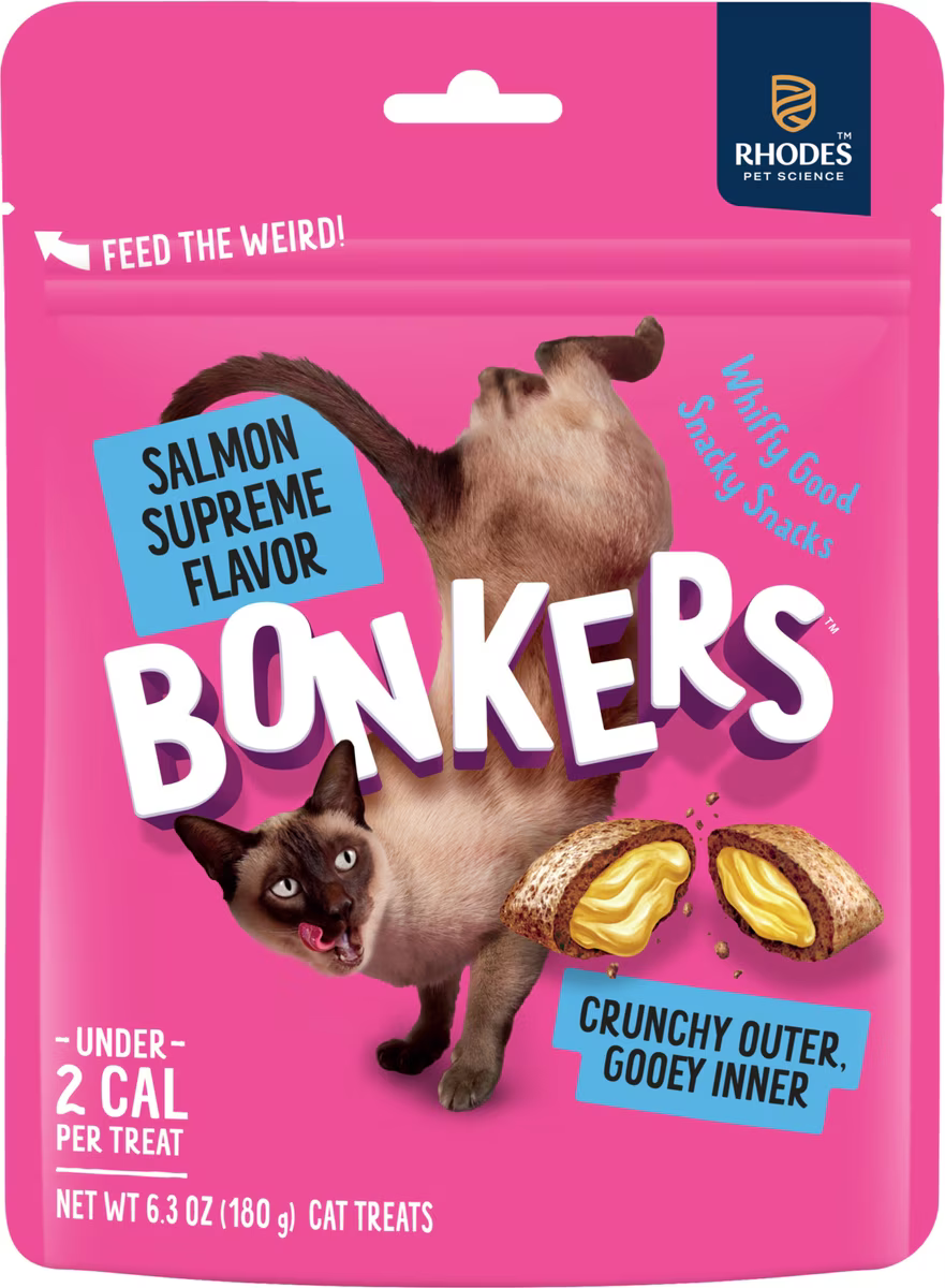 Bonkers Cat Pillows Salmon Supreme Flavored Crunchy Cat Treats have a crunchy outer layer and irresistibly gooey center, delivering a taste and texture that even the pickiest cats will go Bonkers for! Created in collaboration with animal nutritionists, Bonkers’ carefully formulated recipes are made with high-quality proteins and contain no wheat, soy, artificial colors or flavors, so you can feel good about treating your cat. Whether you use them as training rewards, a treat-dispensing toy filler or a just-because snack, these crunchy bites are sure to drive your kitty completely Bonkers!