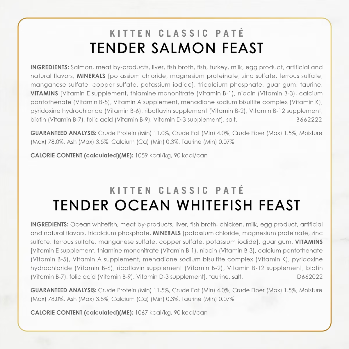 Nurture your kitten’s well-being from nose to tail. Each purchase comes with Fancy Feast Tender Feast Variety Pack Canned Kitten Food, 3-oz, case of 24 & Purina ONE Healthy Kitten Formula Dry Cat Food, 7-lb bag. Fancy Feast Tender Feast Variety Pack Canned Kitten Food features poultry or fish as the #1 ingredient, along with real milk and other high-quality ingredients. Essential vitamins and minerals help support your kitten’s health, and the smooth pate texture is easy for her to eat, giving her a delectable taste with every bite. This wholesome wet kitten food provides 100% complete and balanced nutrition, so you know she’s getting the nutrition she needs to help her grow up strong and healthy. Purina ONE Healthy Kitten Formula Dry Cat Food starts with real chicken as the #1 ingredient and is rounded out with grains and accents of real vegetables, including real carrots and peas. Each cup is packed with 46 grams of protein to support your kitten’s growing muscles, including her healthy heart. Plus, the natural kitten food formula has added vitamins, minerals and nutrients to foster your little friend’s development, including DHA, a nutrient found in mothers’ milk that assists with brain and vision development. Omega-6 fatty acids in every serving promote her healthy skin and soft coat, and Purina ONE for kittens is highly digestible, so more nutrition goes to work inside your kitty. Best of all, kittens love the delectable poultry flavor and the enticing texture of the crunchy kitten kibble, which also helps reduce plaque buildup to keep her teeth clean.