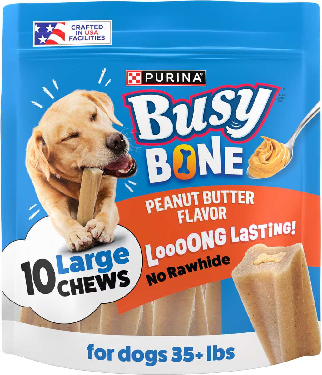 Enticing Busy Bone dog treats with the irresistible yum of peanut butter flavor.