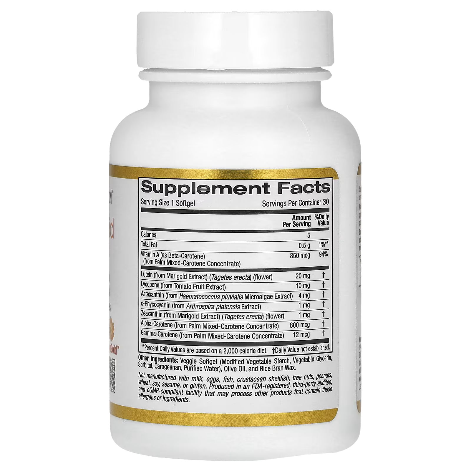 California Gold Nutrition, AstaCarotenoid Complex with Lutein, Lycopene, Astaxanthin, and Vitamin A, 30 Veggie Softgels
