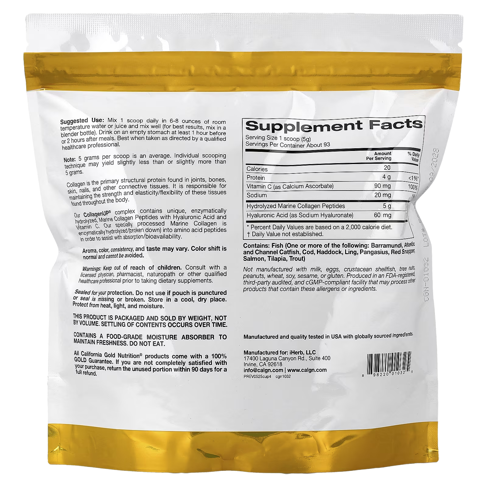 California Gold Nutrition, CollagenUP®, Hydrolyzed Marine Collagen Peptides with Hyaluronic Acid and Vitamin C, Unflavored, 1.02 lb (464 g)