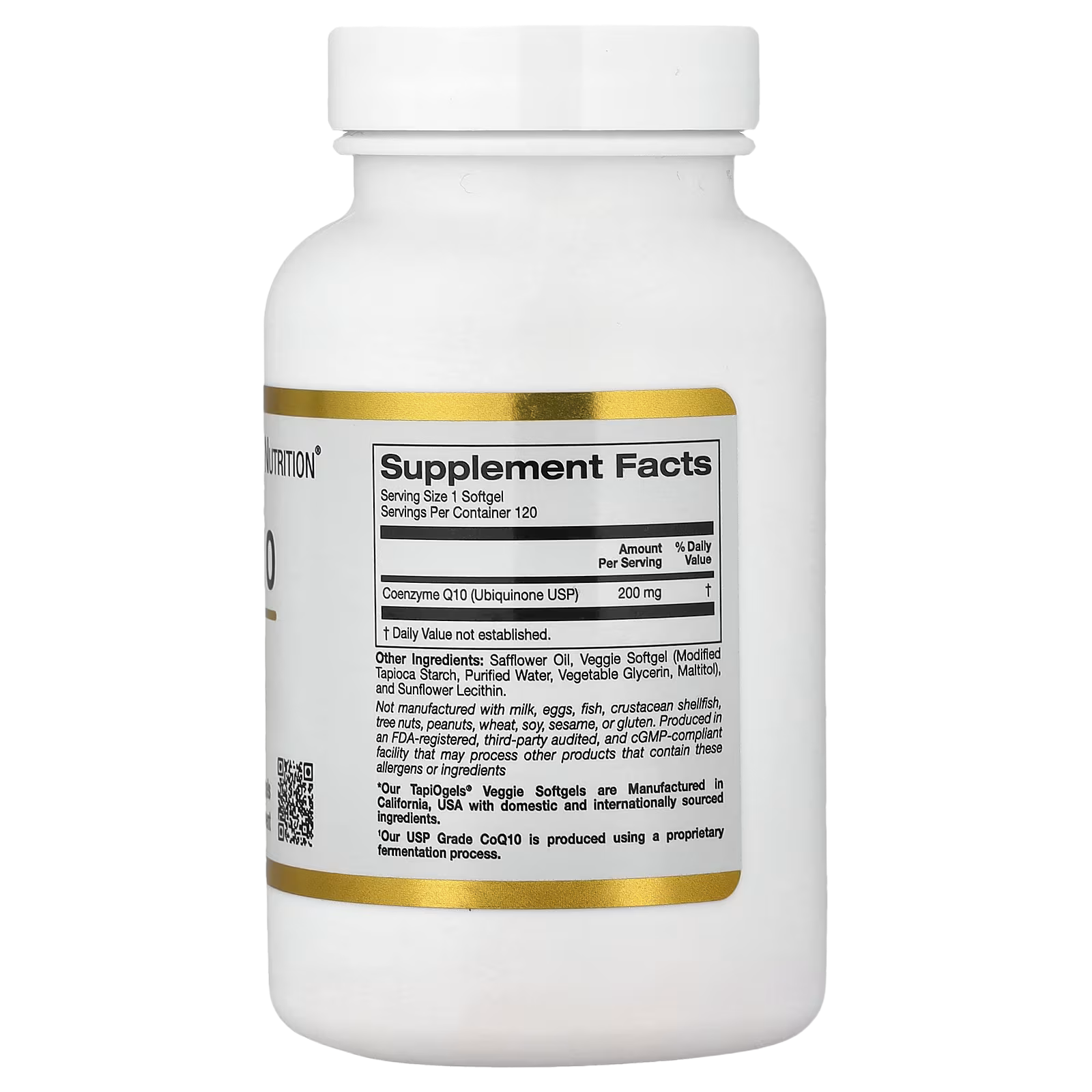 California Gold Nutrition CoQ10 features USP Grade Ubiquinone (CoQ10) that is produced using a proprietary fermentation process and is contained within TapiOgels™ Tapioca Veggie Softgels. When taken as directed, this provides approximately a 4-month supply.