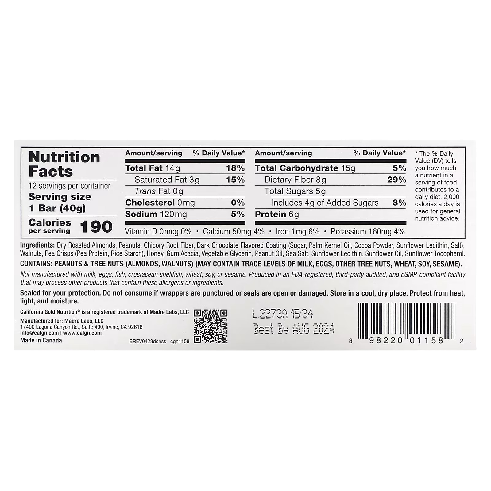 California Gold Nutrition Dark Chocolate, Nuts & Sea Salt Bars are made with simple ingredients, like roasted almonds, peanuts, and walnuts, to create a nutritious and satisfying treat with plenty of fiber and protein. Each bar is individually wrapped, making them perfect for on-the-go snacking anytime, anywhere.