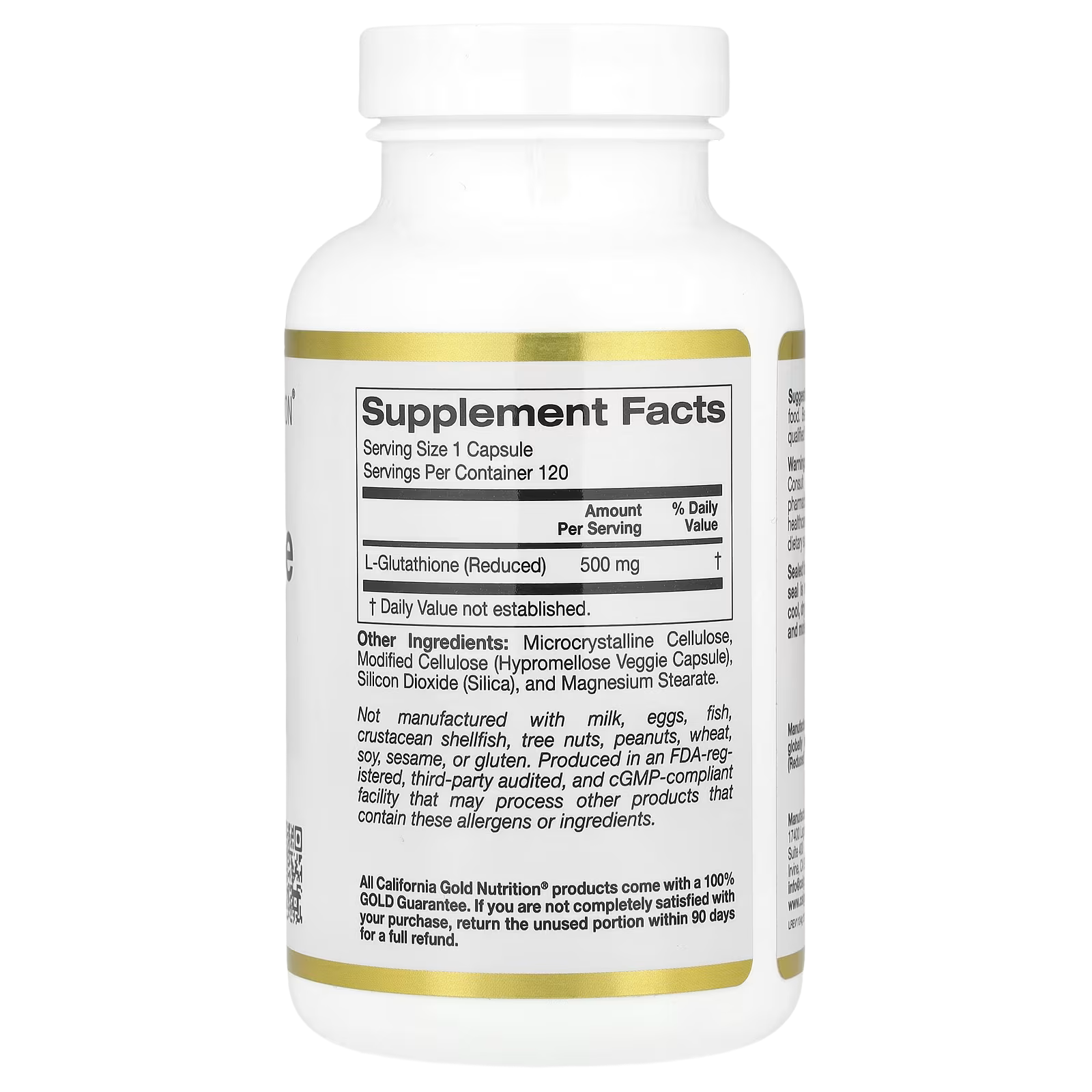 Not manufactured with milk, eggs, fish, crustacean shellfish, tree nuts, peanuts, wheat, soy, sesame, or gluten. Produced in an FDA-registered, third-party audited, and cGMP-compliant facility that may process other products that contain these allergens or ingredients.