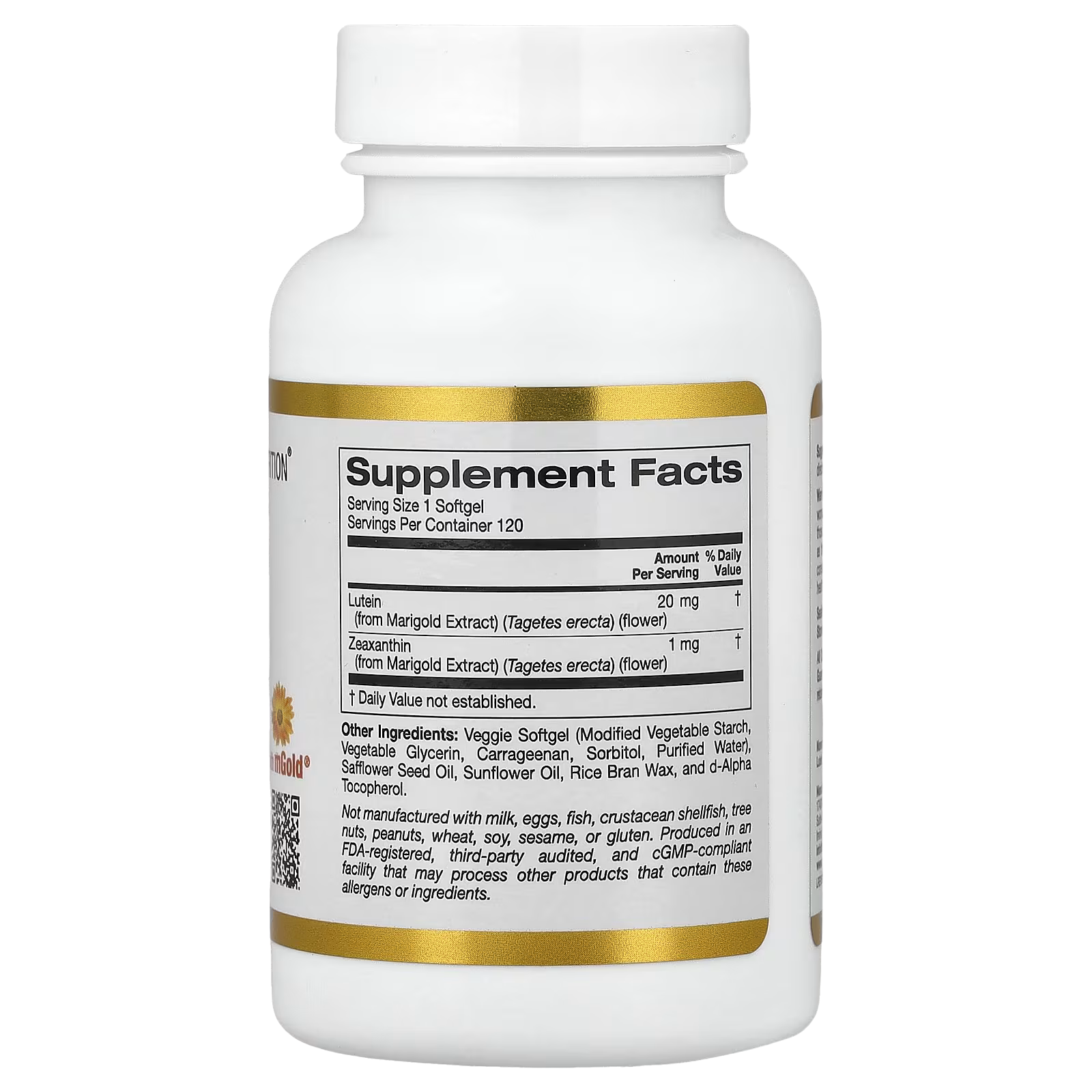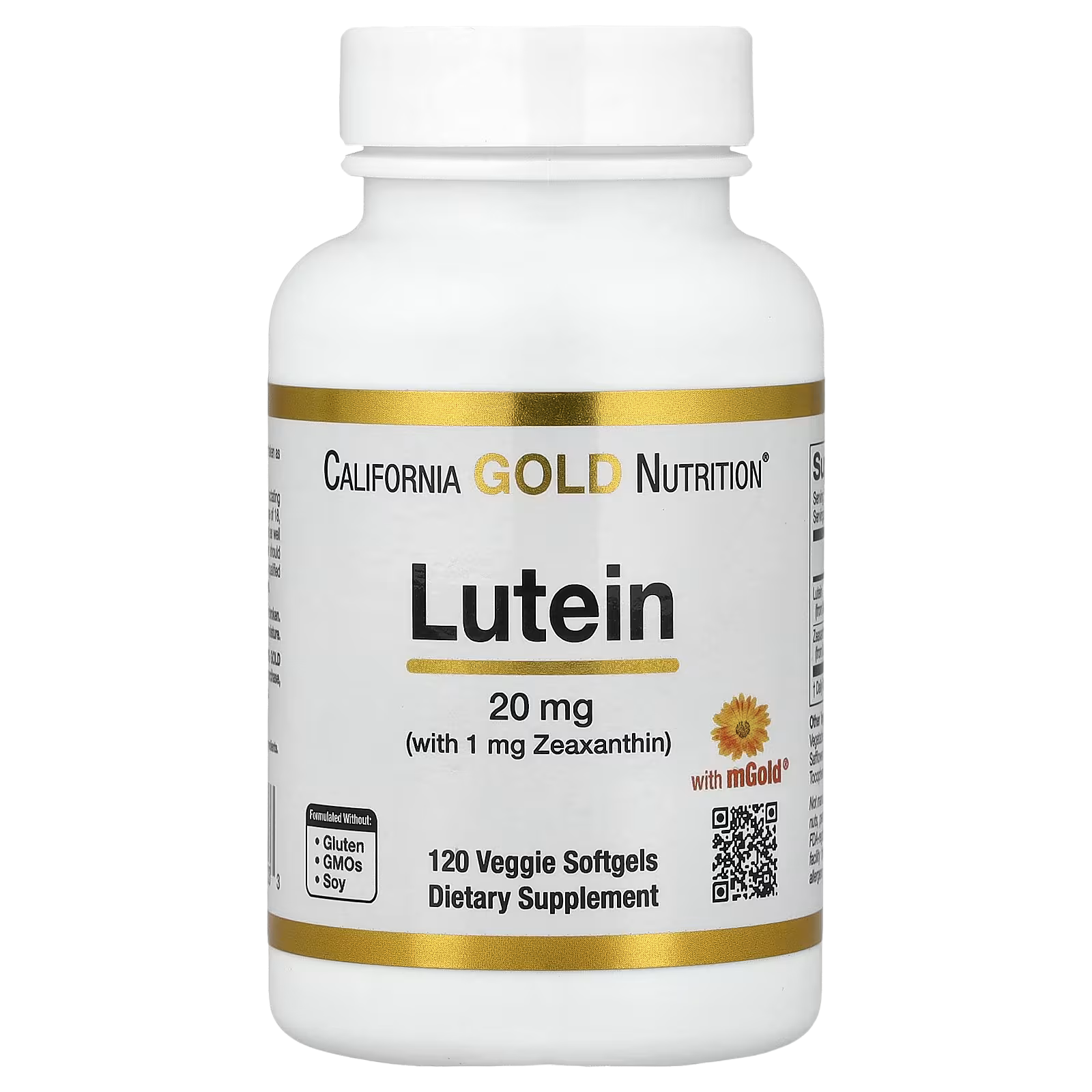 California Gold Nutrition® Lutein with Zeaxanthin, 20 mg is formulated with mGold™ Marigold Extract taken from the marigold flower (Tagetes erecta) and contains both antioxidant carotenoids lutein and zeaxanthin.