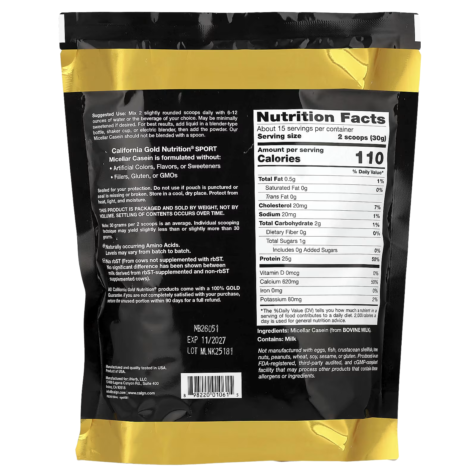 California Gold Nutrition Sport Micellar Casein features 25 grams of protein, 4.7 grams of BCAAs◉, and 4.6 grams of glutamic acid◉ per serving and is exclusively made with dairy from Idaho, USA. This unflavored powder can be added to water or the beverage of your choice for an added boost of protein.