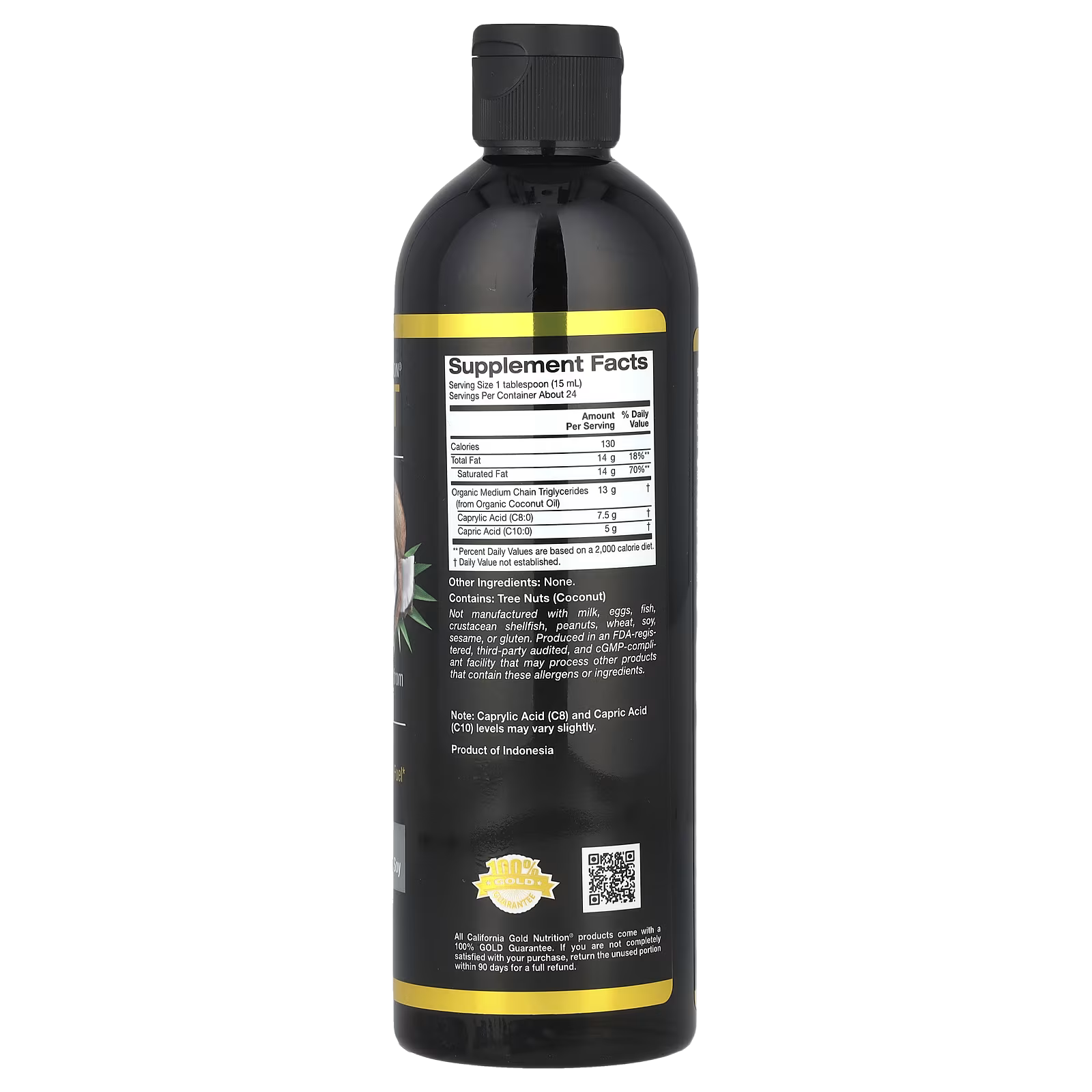 California Gold Nutrition Sport® Organic MCT Oil contains multiple MCTs from organic coconut oil, including caprylic and capric acid. It contains no gluten, GMOS, palm, or soy.
