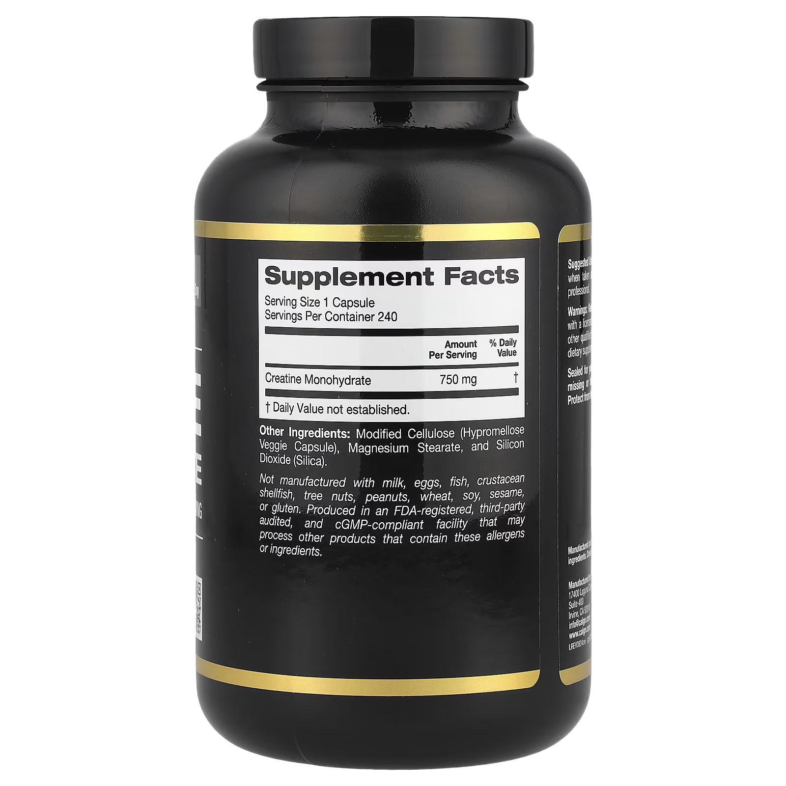 Not manufactured with milk, eggs, fish, crustacean shellfish, tree nuts, peanuts, wheat, soy, sesame, or gluten. Produced in an FDA-registered, third-party audited, and cGMP-compliant facility that may process other products that contain these allergens or ingredients.