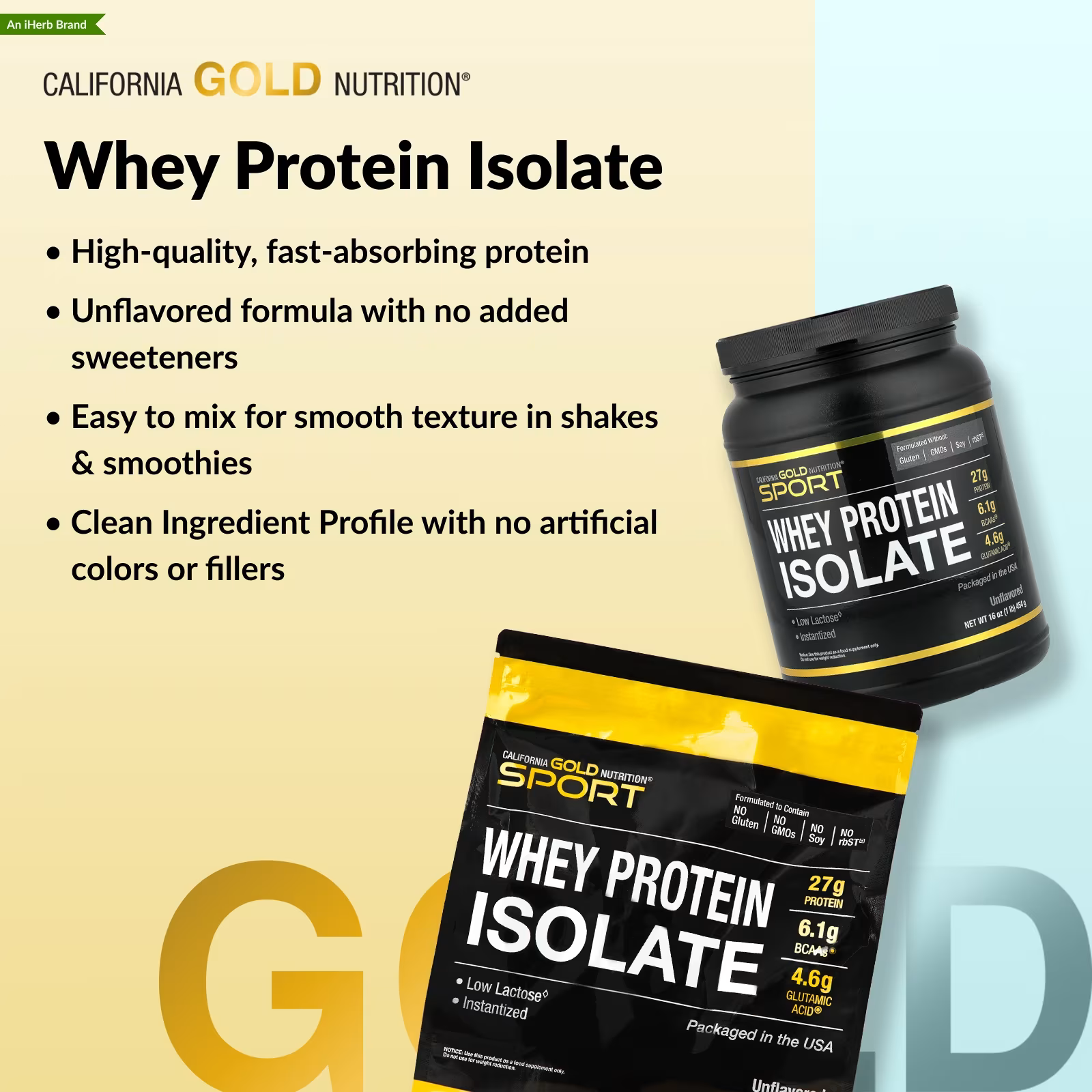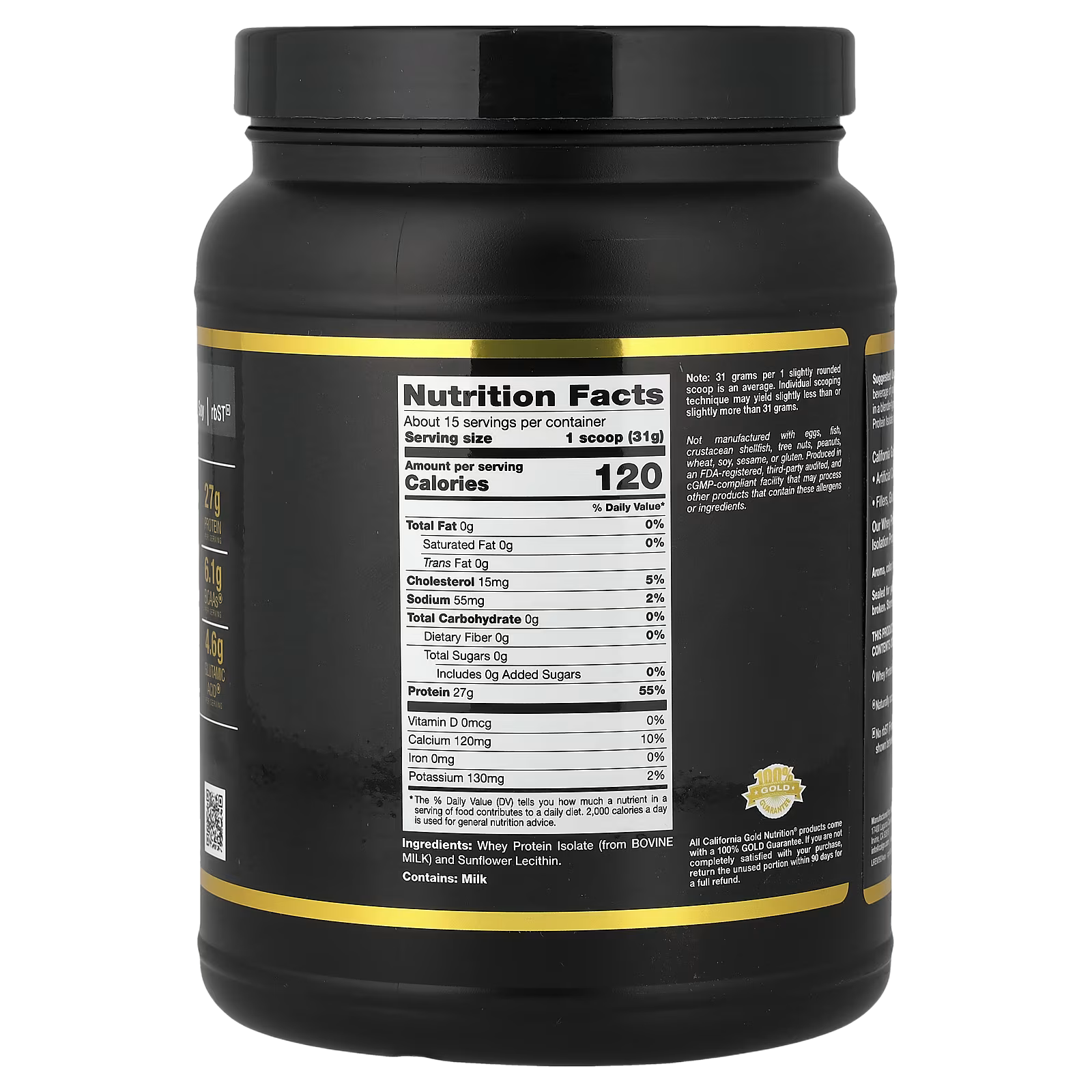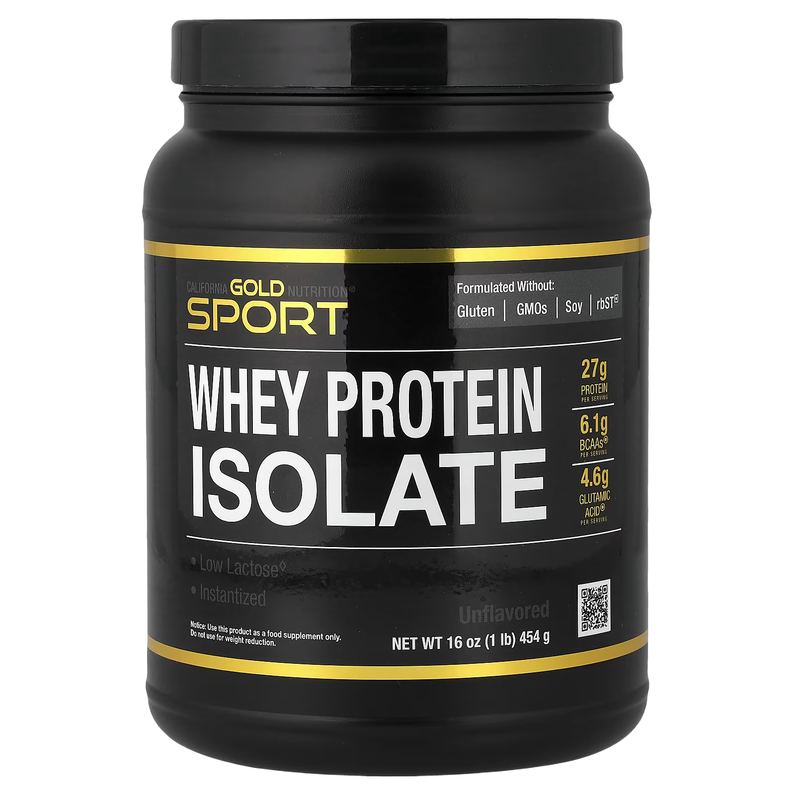 California Gold Nutrition® Sport Whey Protein Isolate features 27 grams of protein and 6.1 grams of Branched Chain Amino Acids (BCAAs) and 4.6 g of Glutamic Acid per serving. It contains low lactose and is manufactured by a multi-stage cold micro-filtration isolation process using state-of-the-art membrane technology.