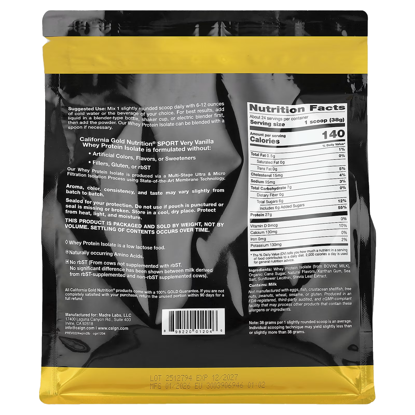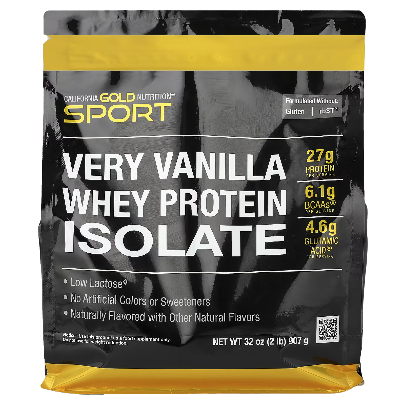California Gold Nutrition Sport Very Vanilla Whey Protein Isolate features more than 25 grams of protein and 6 grams of BCAAs per serving. It contains low lactose and is manufactured by a multi-stage cold micro-filtration isolation process using state-of-the-art membrane technology.