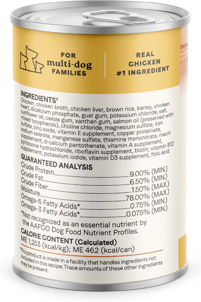 Chicken, Chicken Broth, Chicken Liver, Brown Rice, Barley, Chicken Heart, Dicalcium Phosphate, Guar Gum, Potassium Chloride, Salt, Sunflower Oil, Cassia Gum, Xanthan Gum, Salmon Oil (Preserved With Mixed Tocopherols), Choline Chloride, Magnesium Sulfate, Iron Sulfate, Zinc Oxide, Vitamin E Supplement, Copper Proteinate, Sodium Selenite, Manganese Sulfate, Thiamine Mononitrate, Niacin Supplement, D-Calcium Pantothenate, Vitamin A Supplement, Pyridoxine Hydrochloride, Riboflavin Supplement, Biotin, Vitamin B12 Supplement, Potassium Iodide, Vitamin D3 Supplement, Folic Acid.