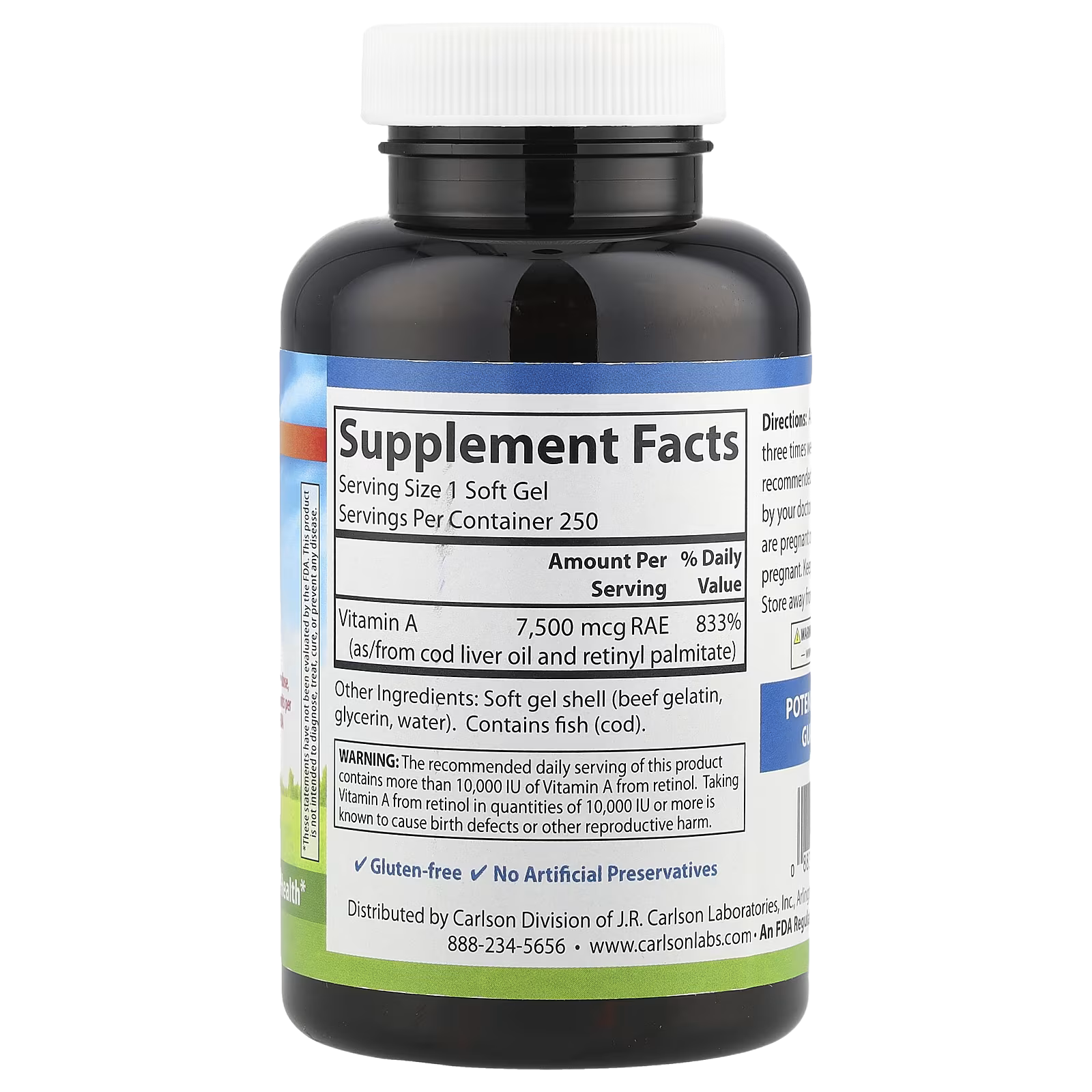 Carlson, Vitamin A, 7,500 mcg RAE (25,000 IU), 250 Soft Gels