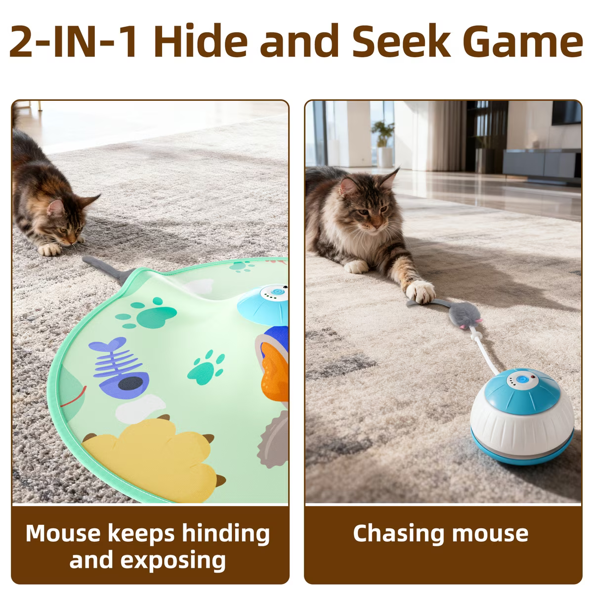 This interactive toy features a motorized mouse popping in and out unexpectedly; it mimics real prey and triggers your cat’s natural hunting instincts, keeping them engaged and entertained.