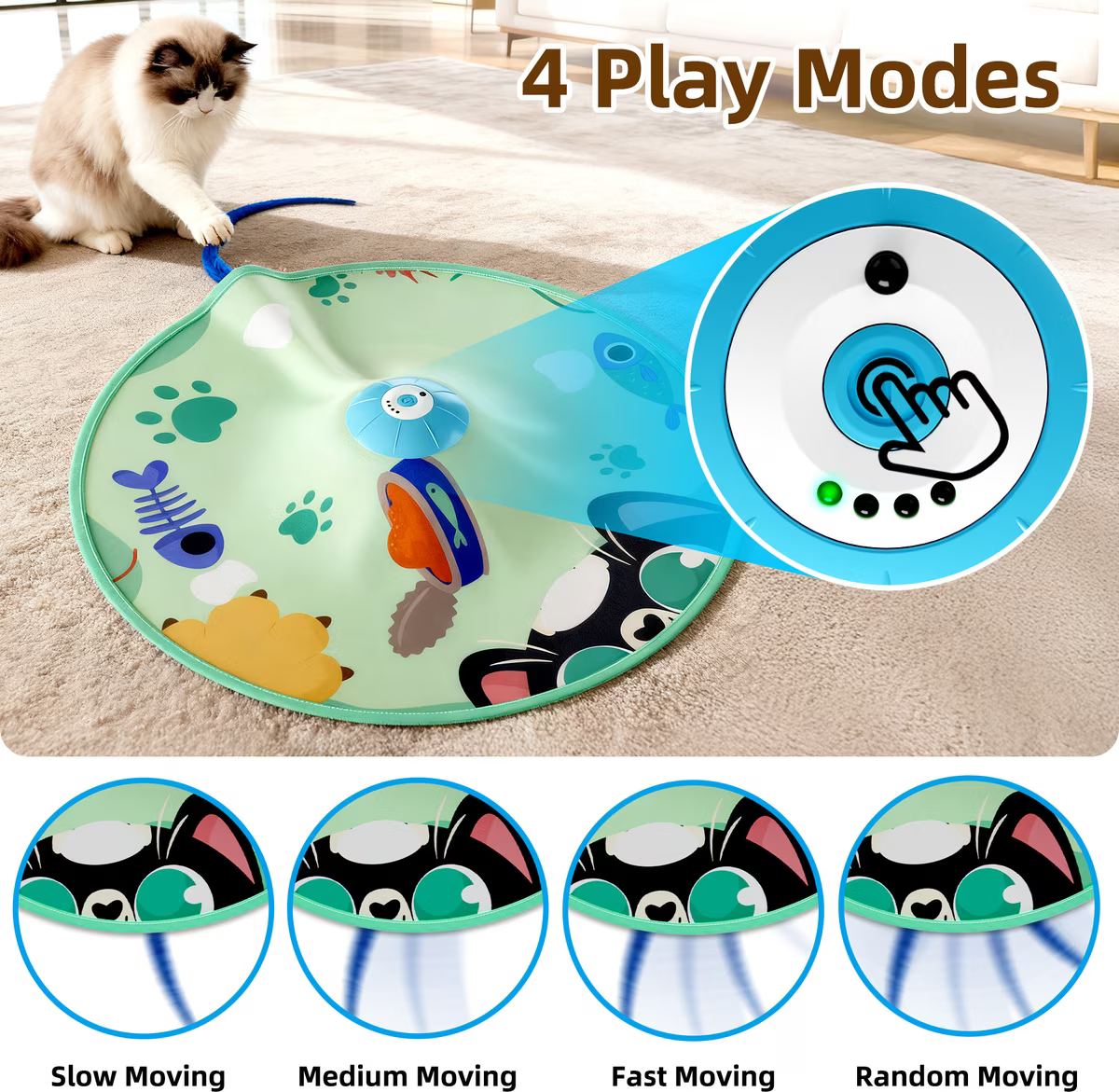 Easily switch between 4 speed settings—slow, medium, fast, and random—to suit your cat’s energy level and mood; the clear speed indicator lights make it easy to operate, even from a distance.