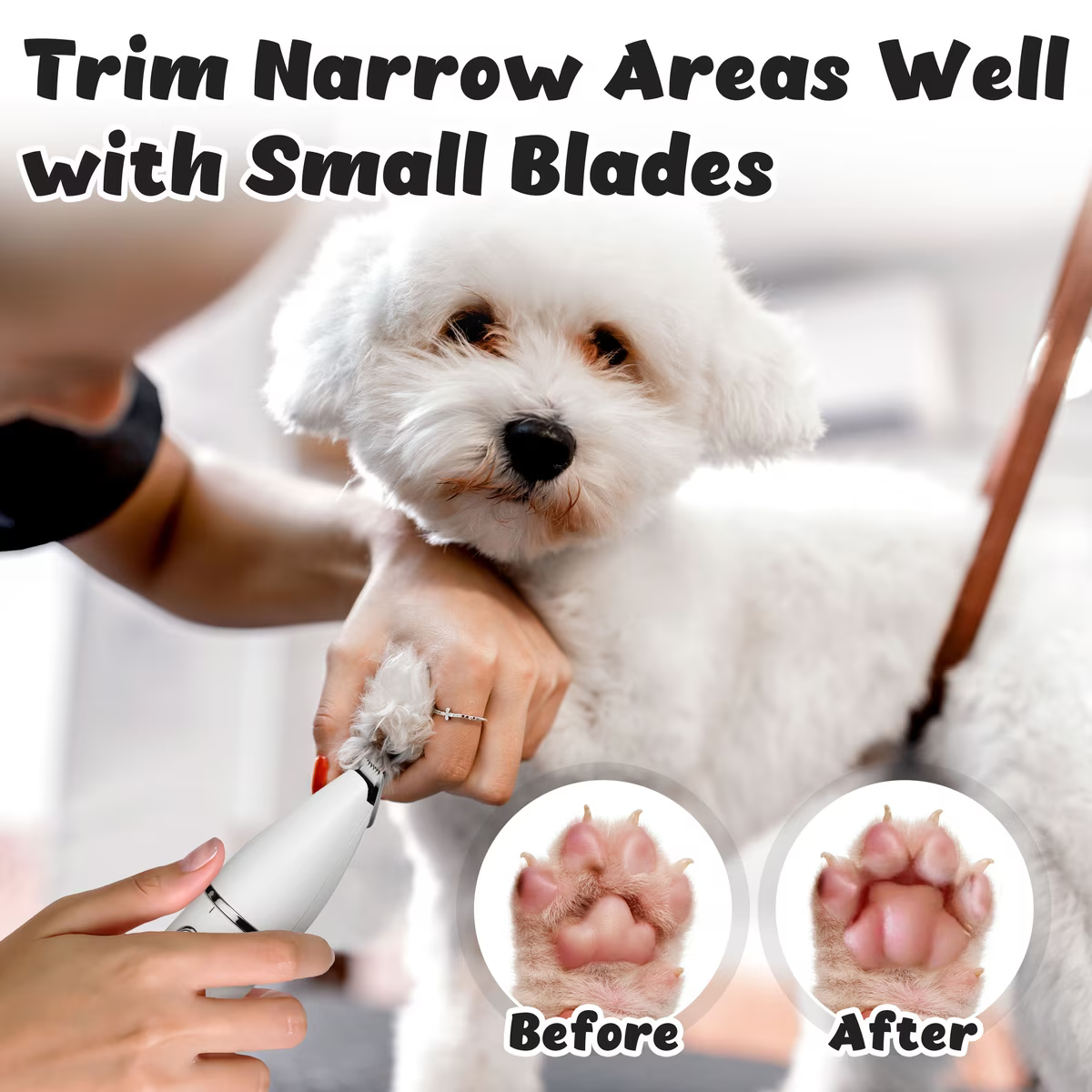 Paw-fect for trimming small areas like paws, ears, face and other hard-to-reach areas.