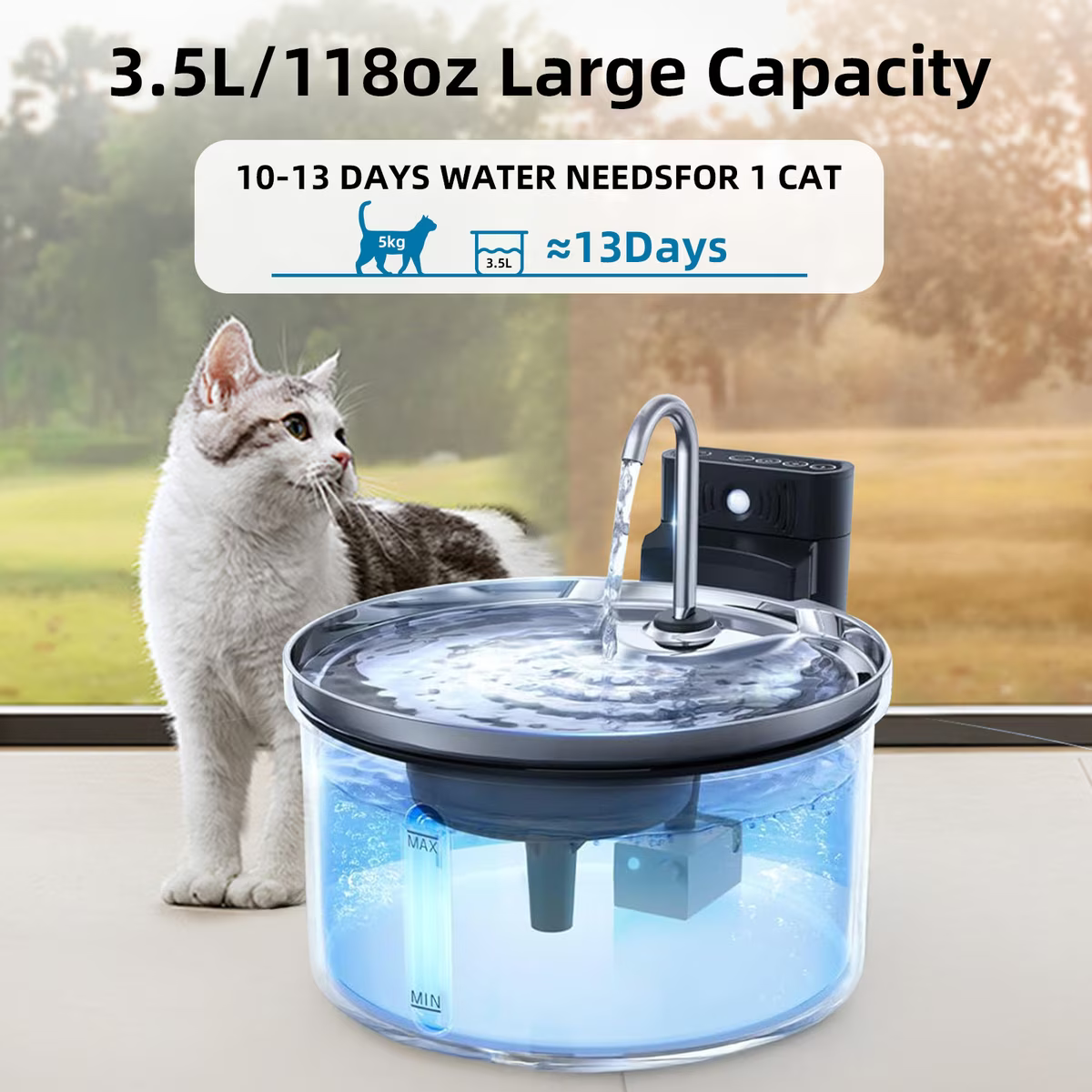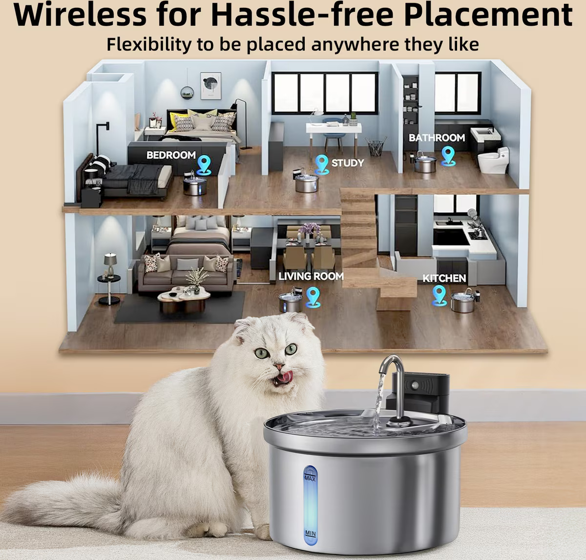 Wireless convenience allows your cat to enjoy fresh, clean water safely anywhere in your home without the hassle of messy wires. With a 2500mAh rechargeable battery, it can provide up to 30 days of uninterrupted use.