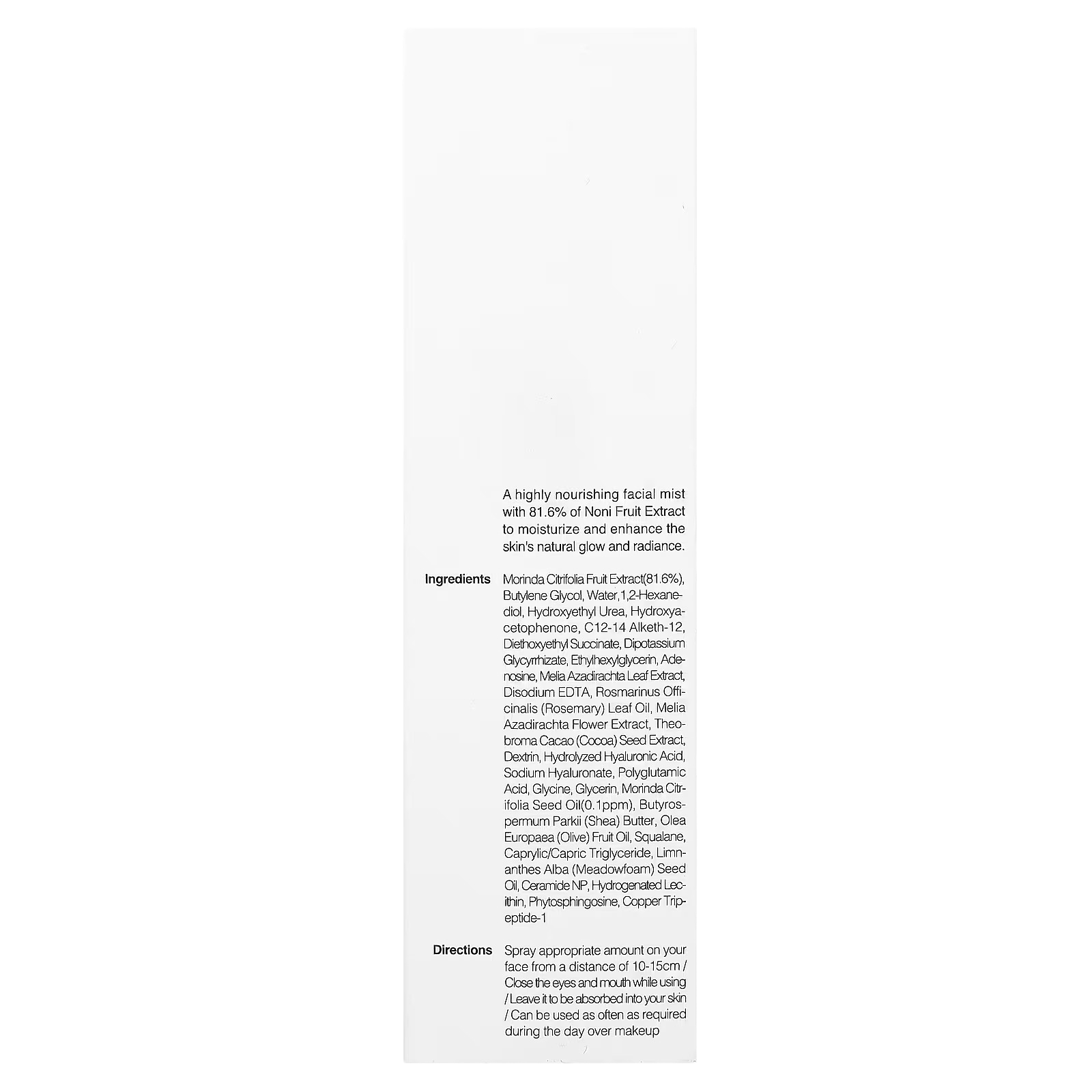 A highly nourishing facial mist with 81.6% of Noni Fruit Extract to moisturize and enhance the skin’s natural glow and radiance.
