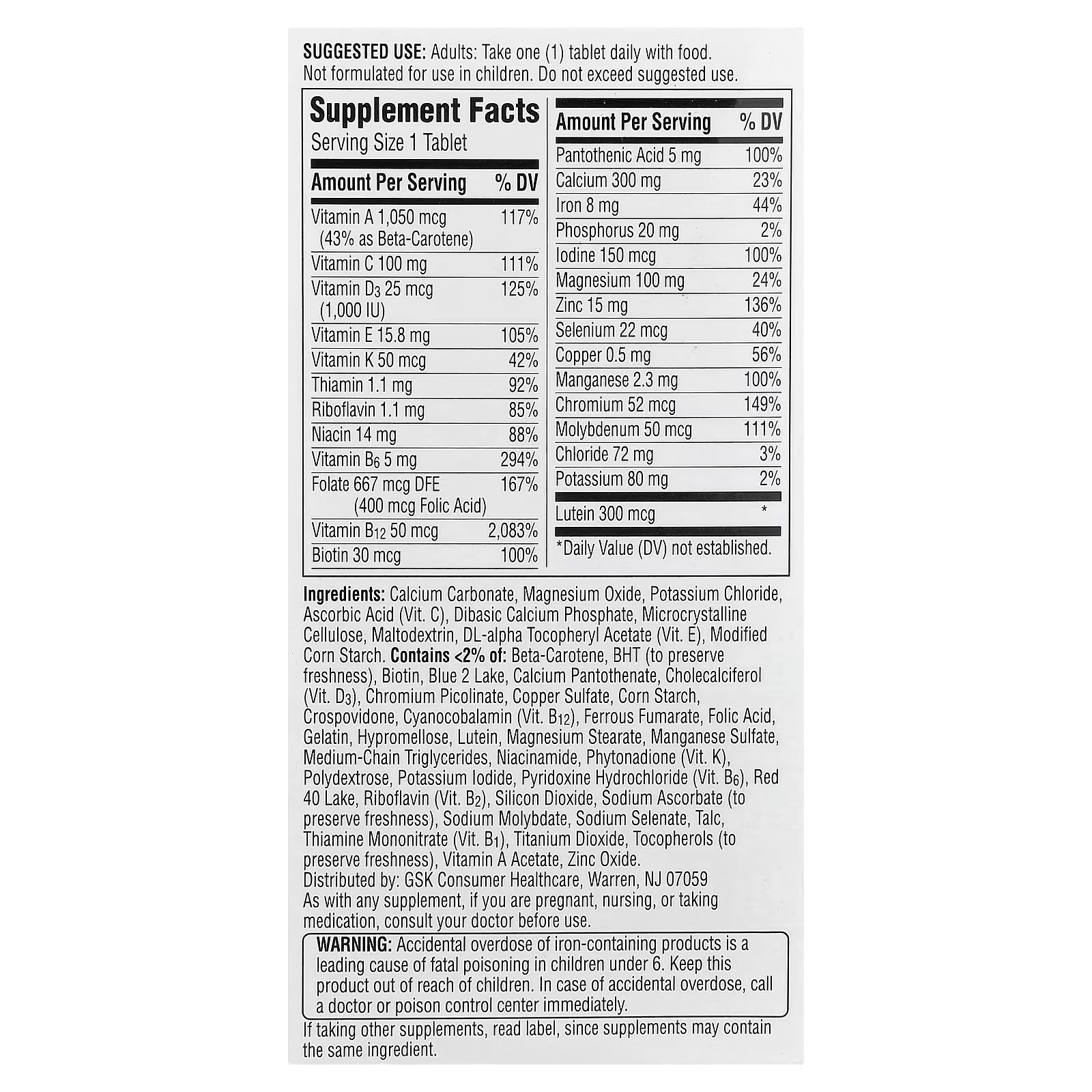 Calcium carbonate, magnesium oxide, potassium chloride, ascorbic acid (vit. c), dibasic calcium phosphate, microcrystalline cellulose, maltodextrin, dl-alpha tocopheryl acetate (vit. e), modified corn starch. Contains <2% of: beta-carotene, bht (to preserve freshness), biotin, blue 2 lake, calcium pantothenate, cholecalciferol (vit. d3), chromium picolinate, copper sulfate, corn starch, crospovidone, cyanocobalamin (vit. b12), ferrous fumarate, folic acid, gelatin, hypromellose, lutein, magnesium stearate, manganese sulfate, medium-chain triglycerides, niacinamide, phytonadione (vit. k), polydextrose, potassium iodide, pyridoxine hydrochloride (vit. b6), red 40 lake, riboflavin (vit. b2), silicon dioxide, sodium ascorbate (to preserve freshness), sodium molybdate, sodium selenate, talc, thiamine mononitrate (vit. b1), titanium dioxide, tocopherols (to preserve freshness), vitamin a acetate, zinc oxide.