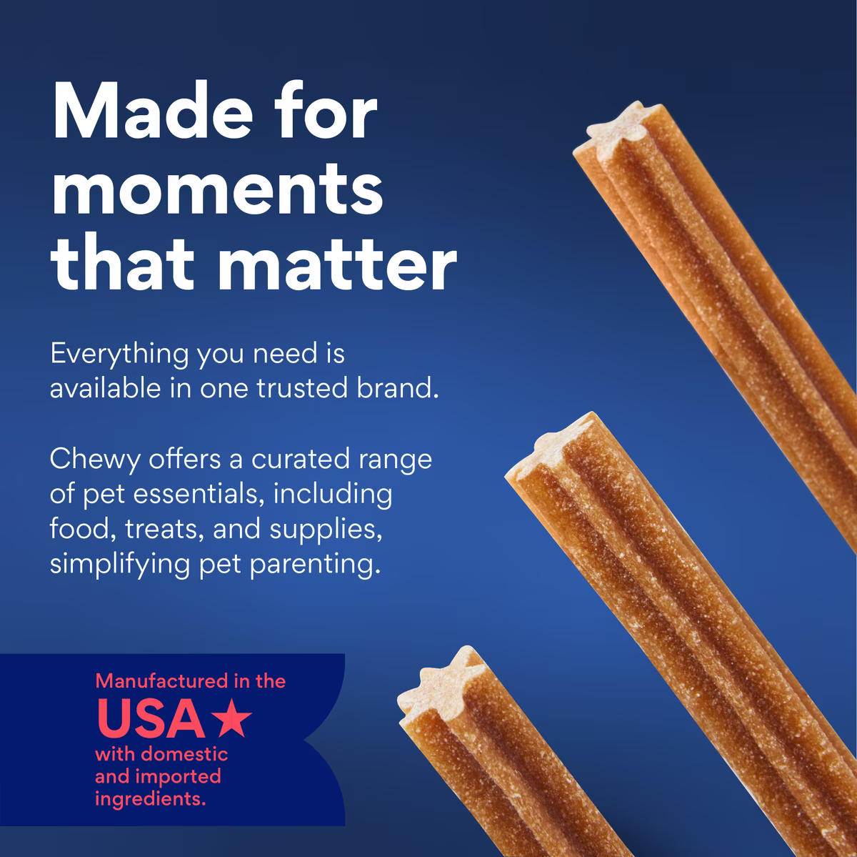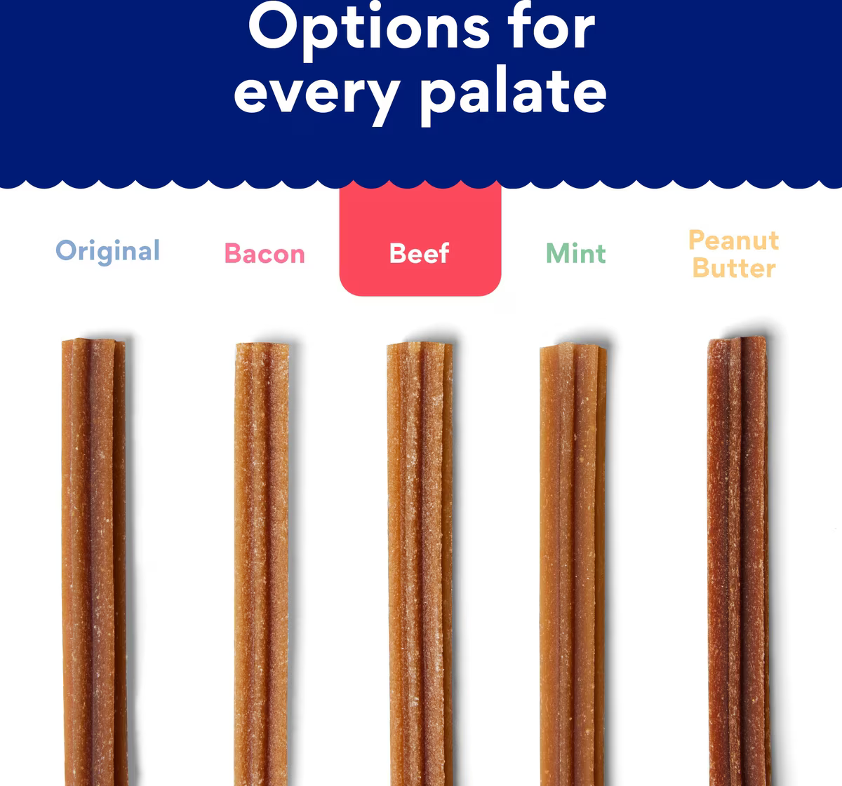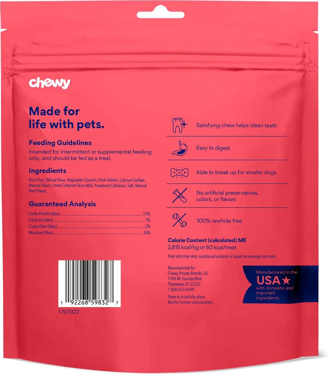 Chewy Made Beef Flavor Natural Dental Treats for Dogs (formerly True Acre Foods) have a chewy texture that helps clean teeth, freshen breath and support oral health while satisfying your dog’s need to chew.