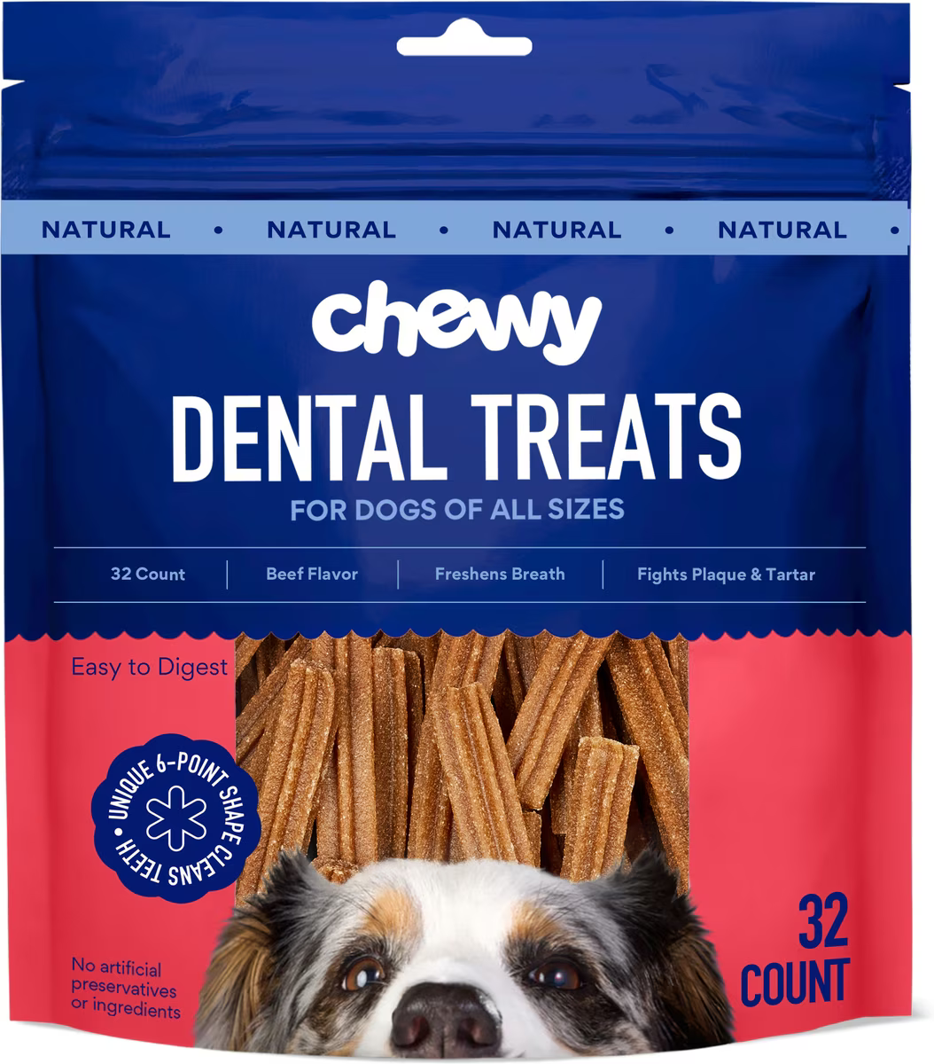 Treat your pal to a tasty treat and fresh breath all-in-one, with Chewy Made Dental Treats. This 3-in-1 treat boasts a natural beef flavor and has a chewy texture that helps clean your pup’s teeth, freshen their breath, and indulge their instinctive desire to chow down with a productive outlet. The chewy texture helps fight plaque and tartar, while your dog stays busy chewing away. The unique six-point shape helps support a clean mouth and fresh breath. With no added sugar, artificial colors, flavors or preservatives, they’re perfect for using as a reward. Feed them whole or break into smaller pieces for use in training or for smaller breeds. True Acre Foods were always Chewy made. Now it’s getting our name. Same ingredients. New look.