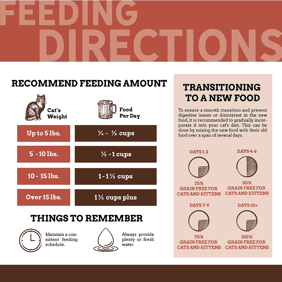 Adult Cats: Food requirements will vary depending on breed, environment, temperature, and stress factors. Feed twice a day or fill bowl every morning. Show cats will require additional amounts of food depending on their degree of activity and stress. Food intake should be adjusted to maintain optimum body weight.