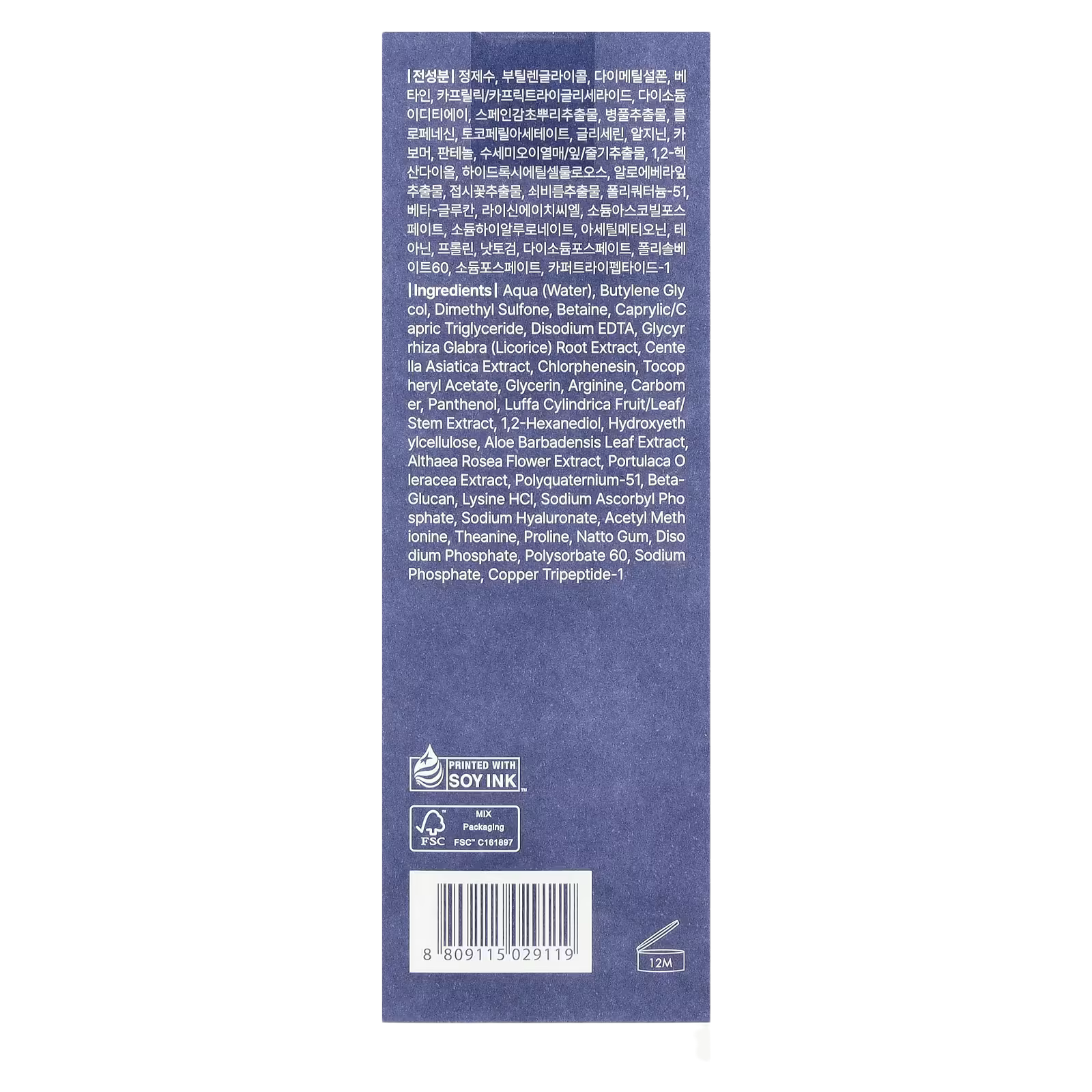 Aqua (water), butylene gly col, dimethyl sulfone, betaine, caprylic/capric triglyceride, disodium edta, glycyrrhiza glabra (licorice) root extract, centella asiatica extract, chlorphenesin, tocopheryl acetate, glycerin, arginine, carbomer, panthenol, luffa cylindrica fruit/leaf/ stem extract, 1,2-hexanediol, hydroxyethylcellulose, aloe barbadensis leaf extract, althaea rosea flower extract, portulaca oleracea extract, polyquaternium-51, beta- glucan, lysine hci, sodium ascorbyl phosphate, sodium hyaluronate, acetyl methionine, theanine, proline, natto gum, disodium phosphate, polysorbate 60, sodium phosphate, copper tripeptide-1.