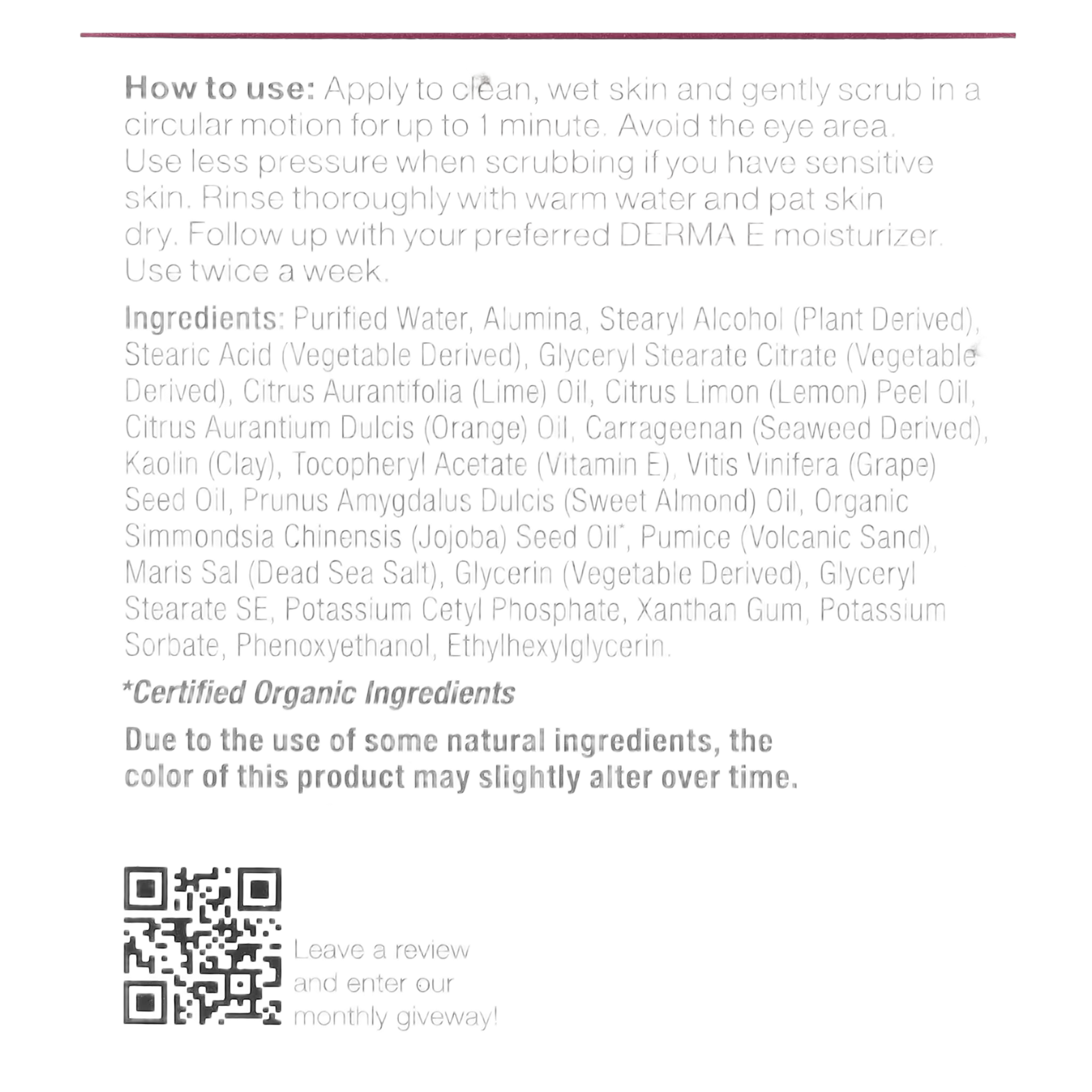 Apply to clean, wet skin and gently scrub in a circular motion for up to 1 minute. Avoid the eye area. Use less pressure when scrubbing if you have sensitive skin. Rinse thoroughly with warm water and pat skin dry. Follow up with your preferred DERMA E moisturizer. Use twice a week.
