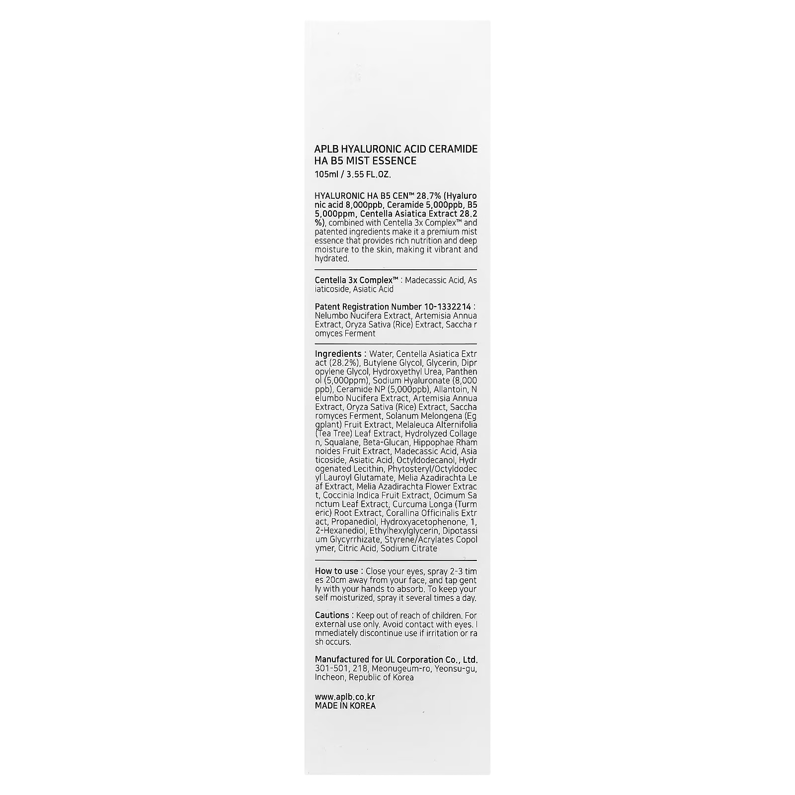 Hyaluronic HA B5 Cen™ 28.7% (Hyaluronic acid 8,000 ppb, Ceramide 5,000 ppb, B5 5,000 ppm, Centella Asiatica Extract 28.2 %), combined with Centella 3x Complex™ and patented ingredients make it a premium mist essence that provides rich nutrition and deep moisture to the skin, making it vibrant and hydrated.