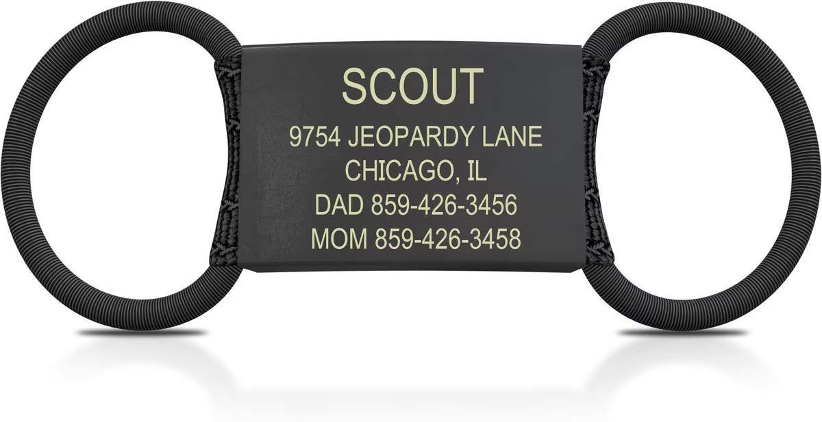 With the DOG iD Personalized Dog ID Tag you won’t have to mingle with the jingle, hang with the hang down, or wrestle with readability! This pet ID is designed to fix all the frustrations of traditional ID tags. Use the dual-ended elastic bands to safely secure the tag to your dog’s collar or harness (sold separately). The flat design won’t dangle or jingle, and it resists snagging for added safety. Plus, your information is laser engraved onto medical-grade stainless steel, so there’s no need to sweat moisture or friction wiping the important details away. Enjoy your next adventure with confidence and DOG iD!