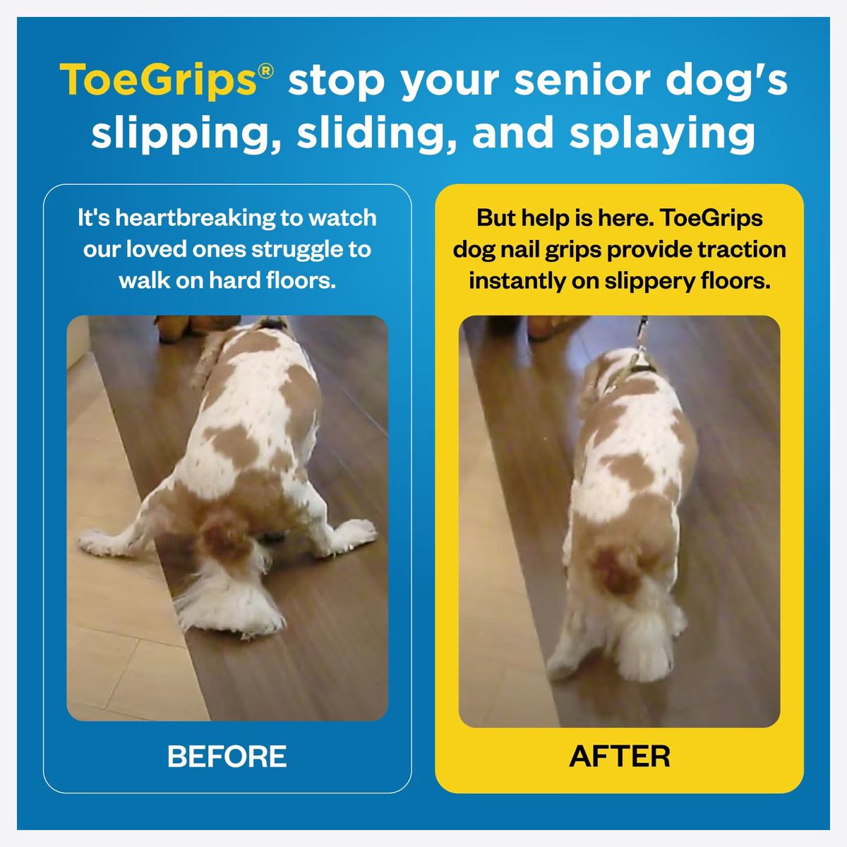 ToeGrips are available in multiple sizes and don’t need to be glued to your furbaby’s nails.