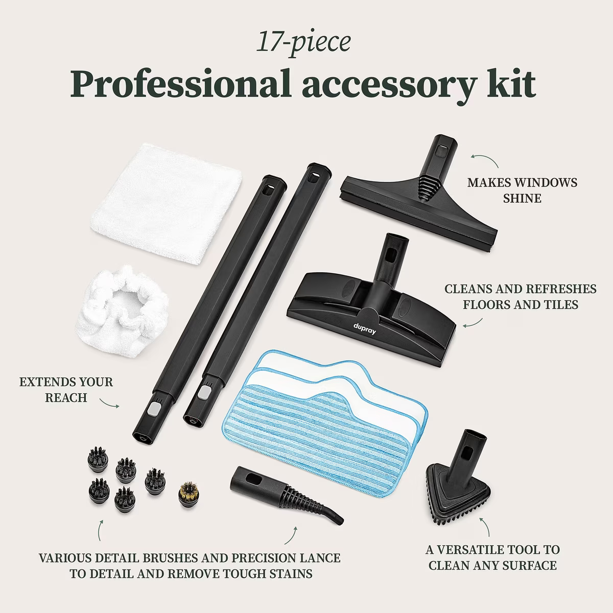 1 x Floor Tool,1 x Steam Lance,1 x Triangle Tool,1 x Window Tool,2 x Extension Tube,1 x Brass Brush,5 x Nylon Brushes,3 x Microfiber Pads,1 x Microfiber Cloth,1 x Microfiber Bonnet